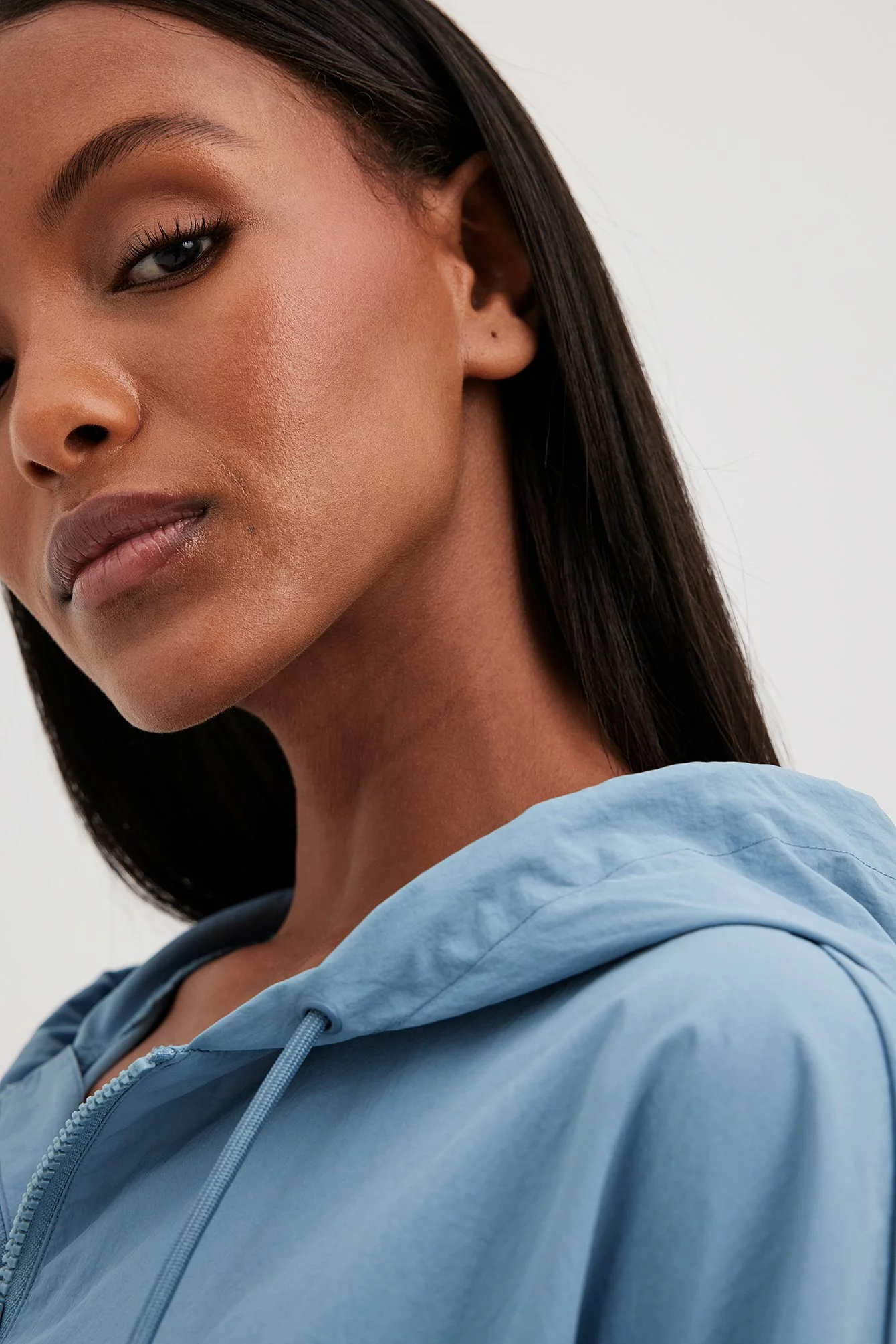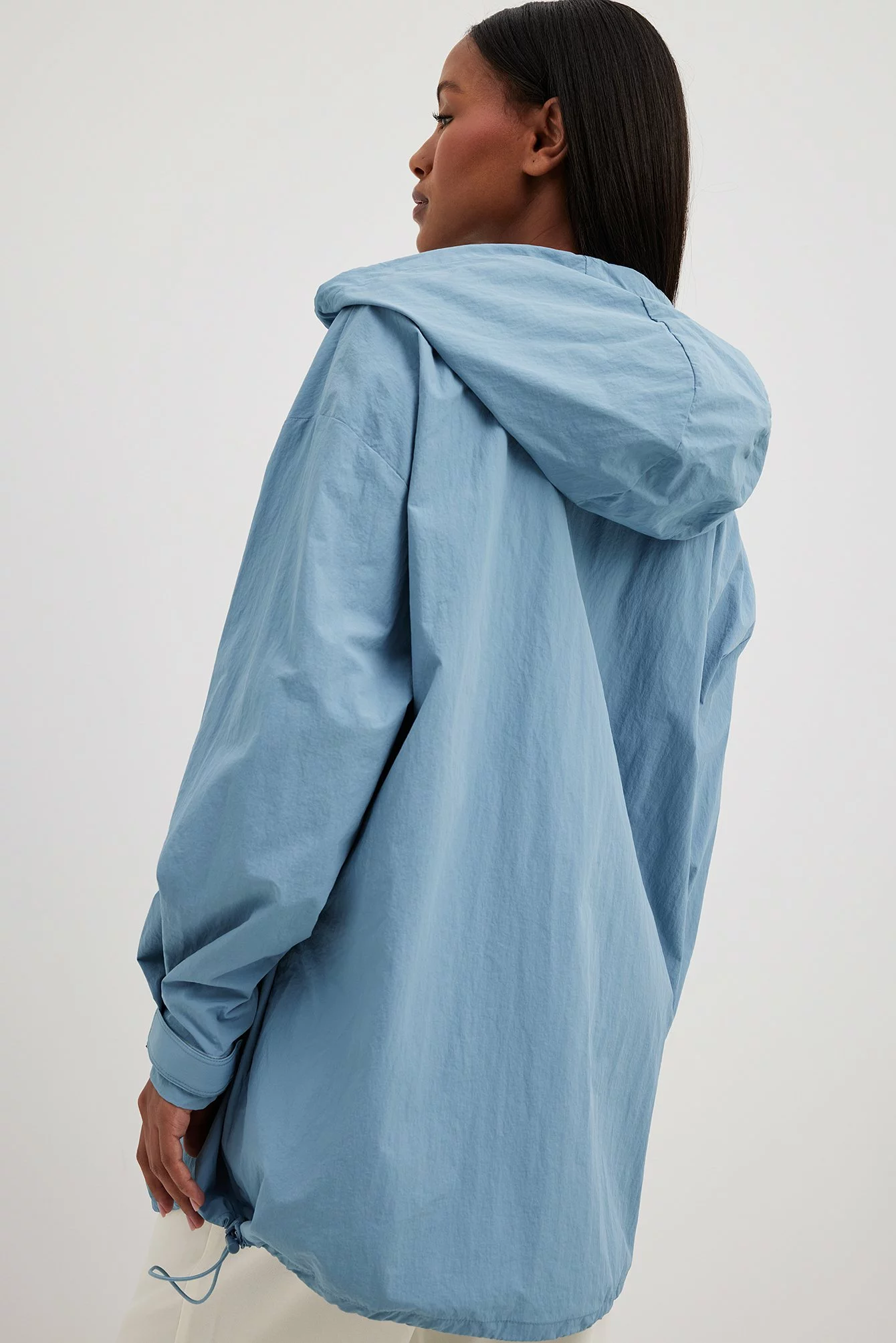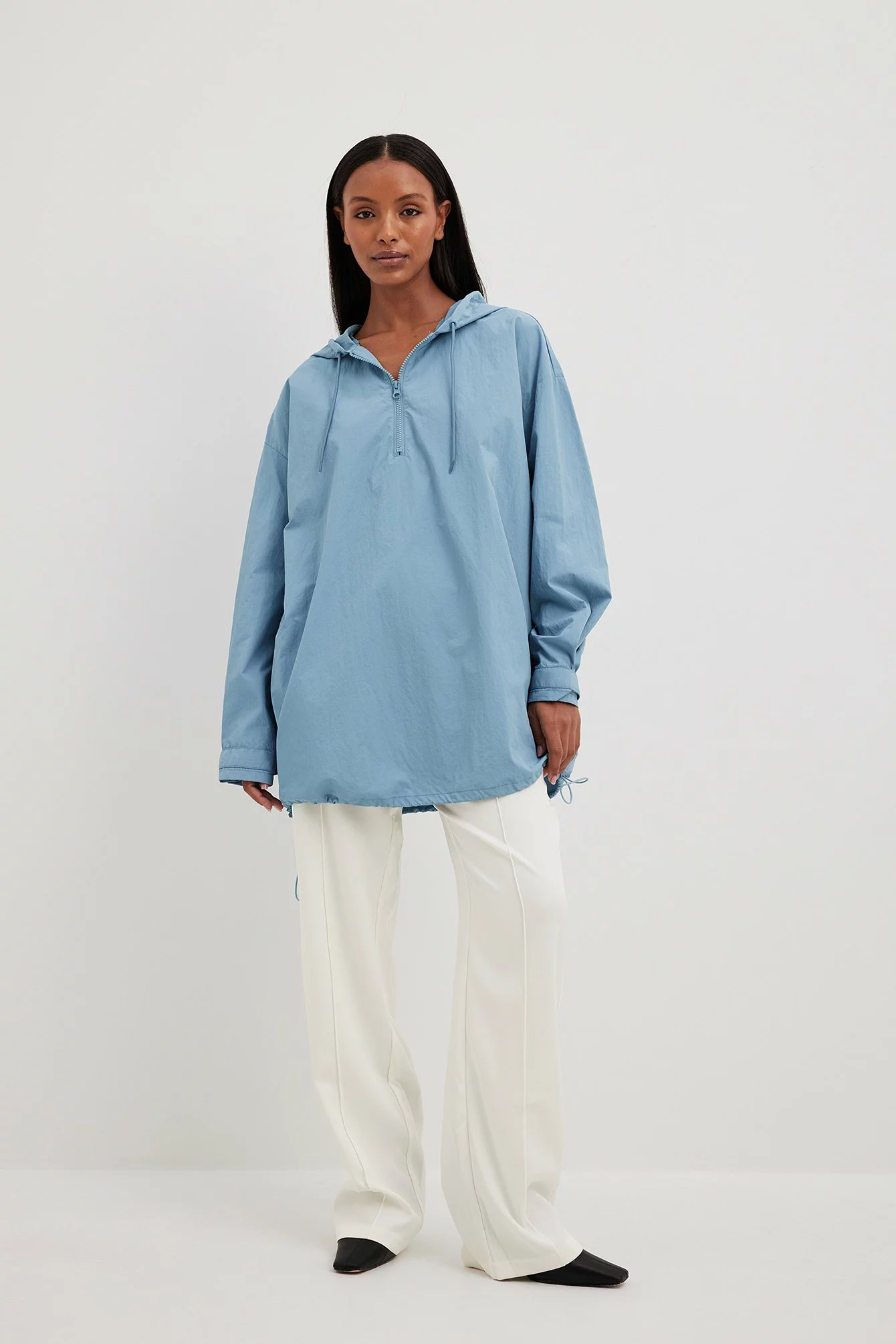 This windbreaker features a hood with drawstring details, a half-up zipper, a drawstring detail at the bottom and long sleeves with velcro straps.