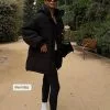 This coat features padded shoulders with button details. It has double button closures at the front and button cuffs. This coat features front flap pockets, a back slit detail and button details at the back.