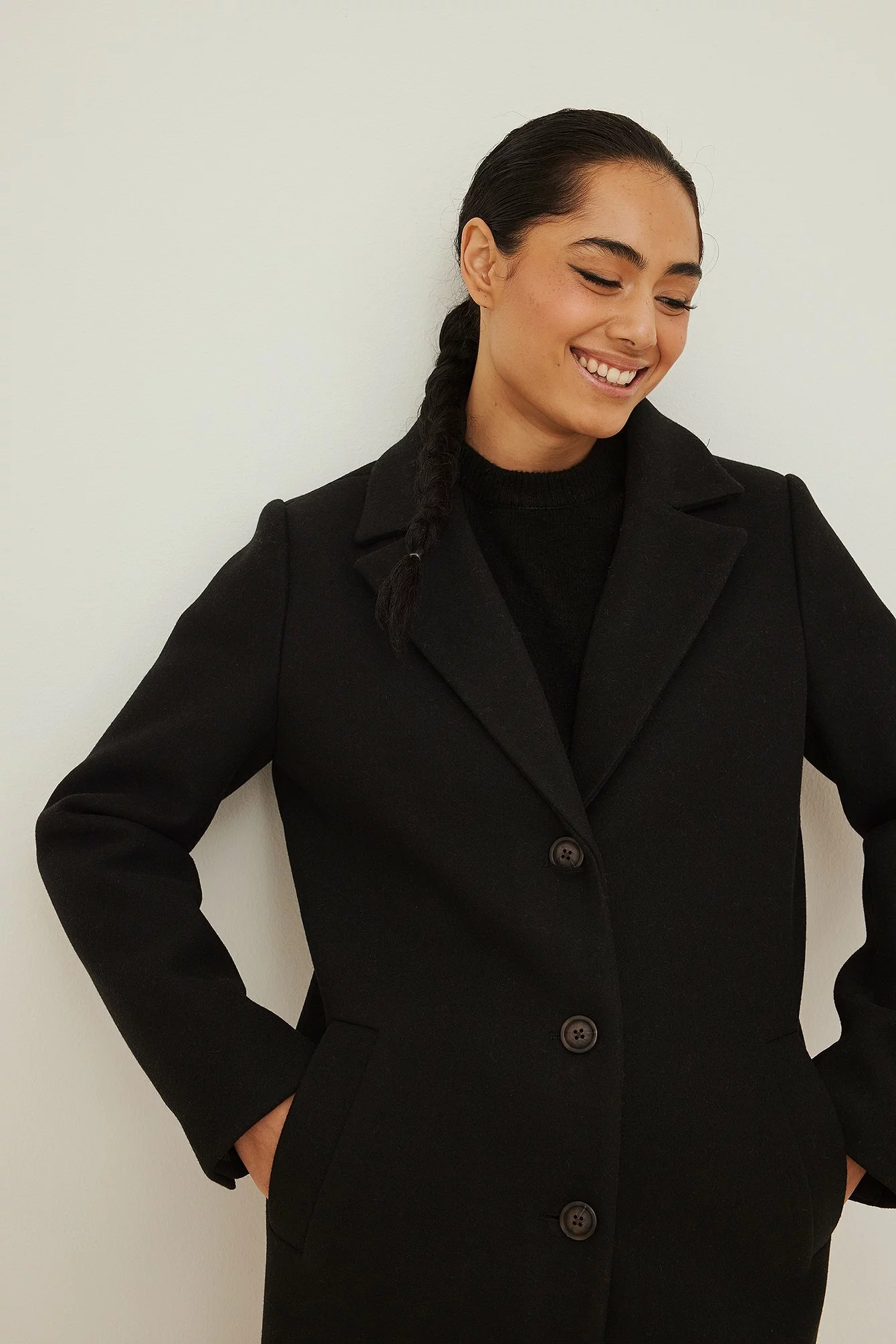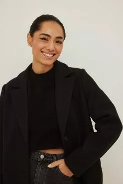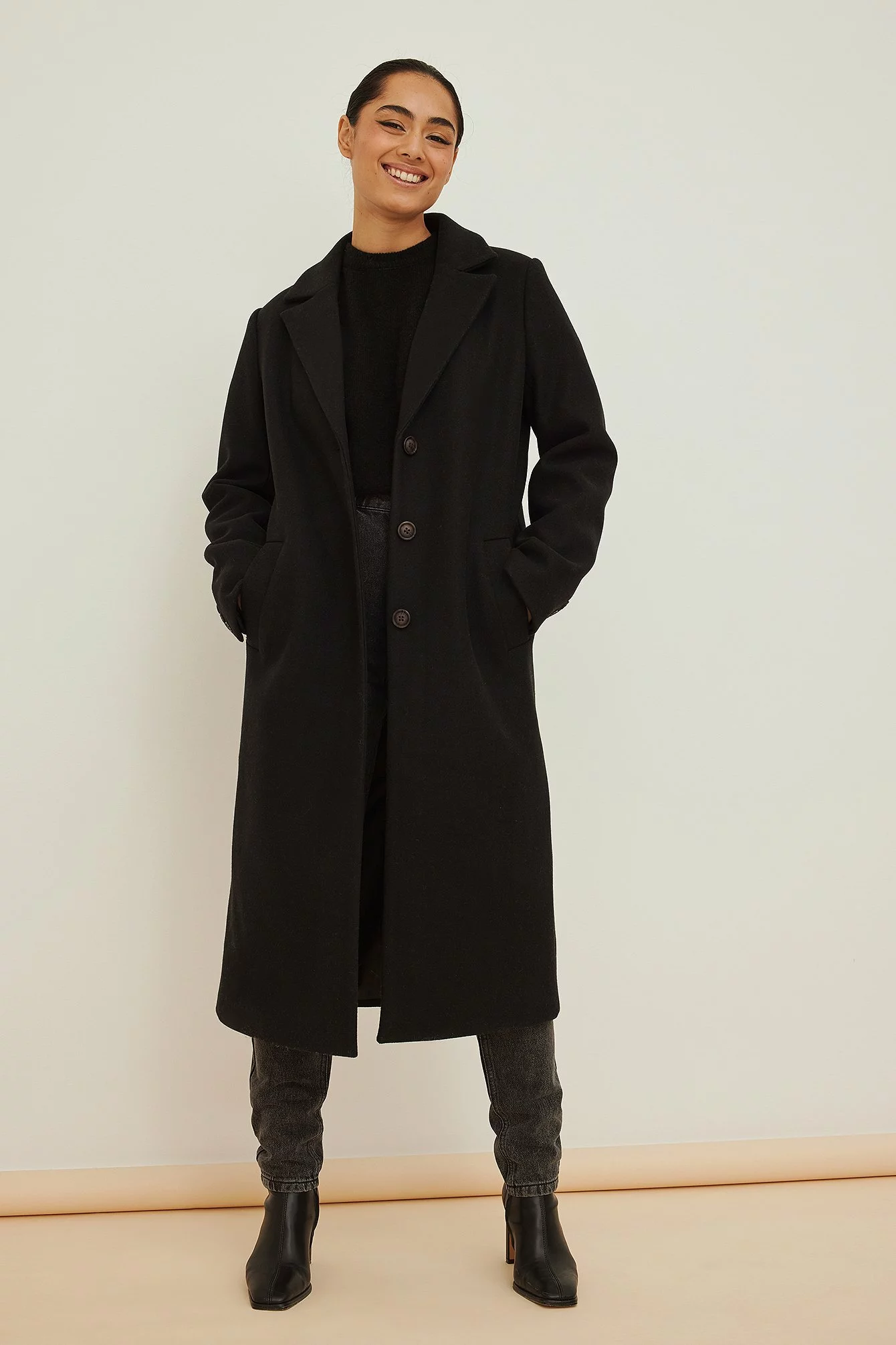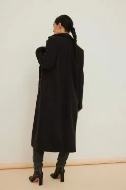 This coat features a lapel neckline, long sleeves with triple button cuffs, a button closure down the front, two side pockets and a midi length.