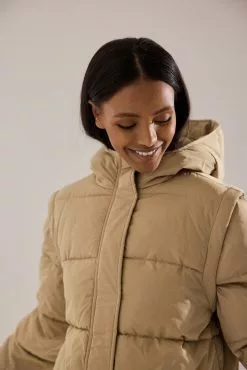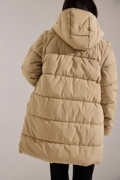 This padded jacket features a long fit. It has a hood and removable sleeves. This padded jacket features two side pockets.