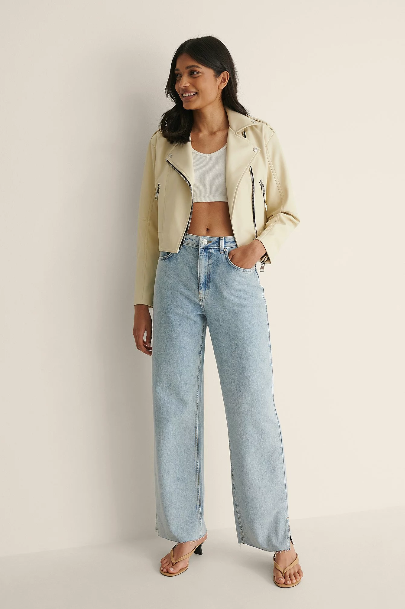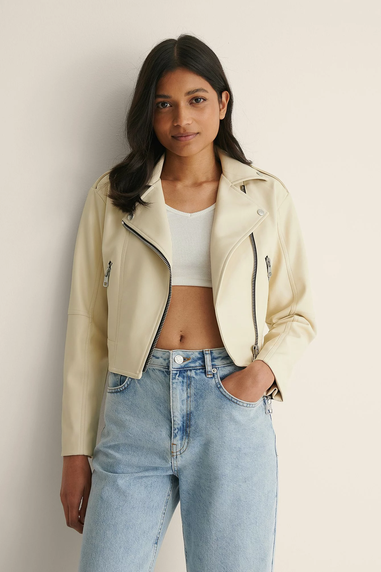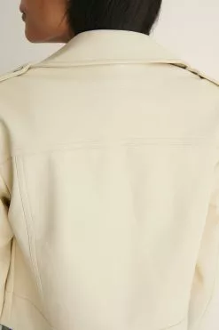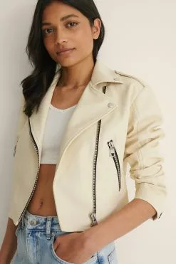 This jacket is lined and features a faux leather material, a classic collar with snap button closures, a zipper closure at the front, two side pockets with a zipper closure, a button detail at the shoulders, long sleeves with a zipper closure at the end, cropped length and a soft material.