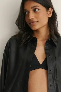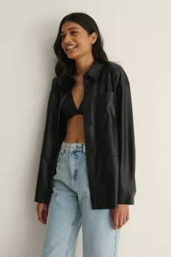 This overshirt features a faux-leather design, a breast pocket, long sleeves, cuffs with a button closure, button closures, a soft material and a classic collar.