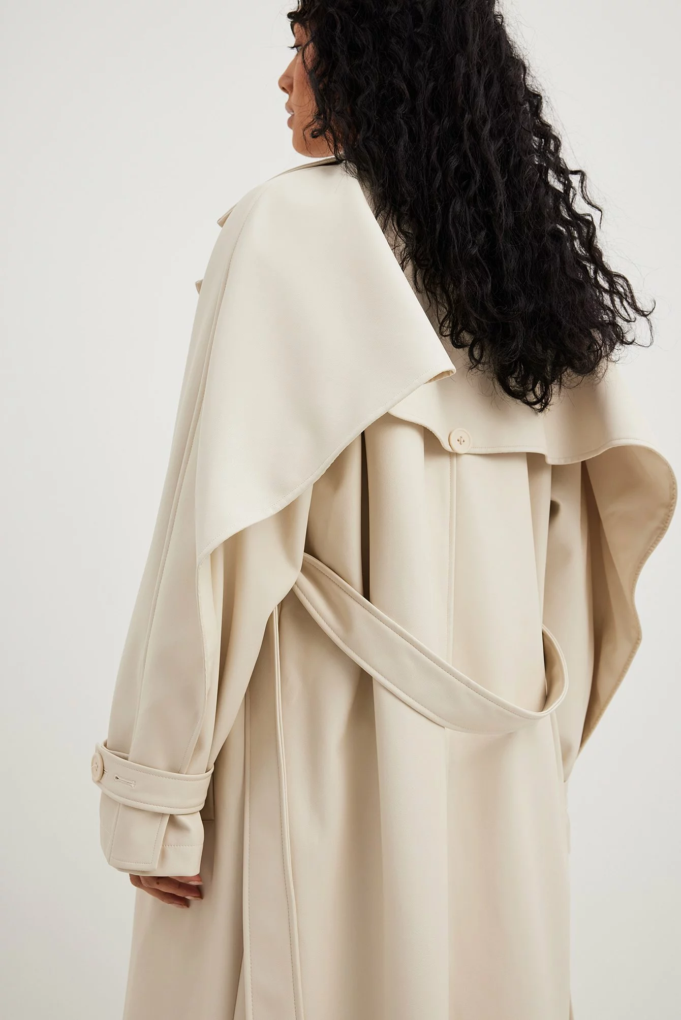 This trenchcoat features an oversized fit. It has a faux leather material and a thin fabric lining. This trenchcoat features a double-breasted button design, cuffs with an adjustable button detail, two side slanting pockets at the front, a self-tie belt at the waist, a button detail at the back and a back slit detail.