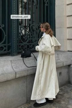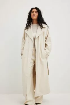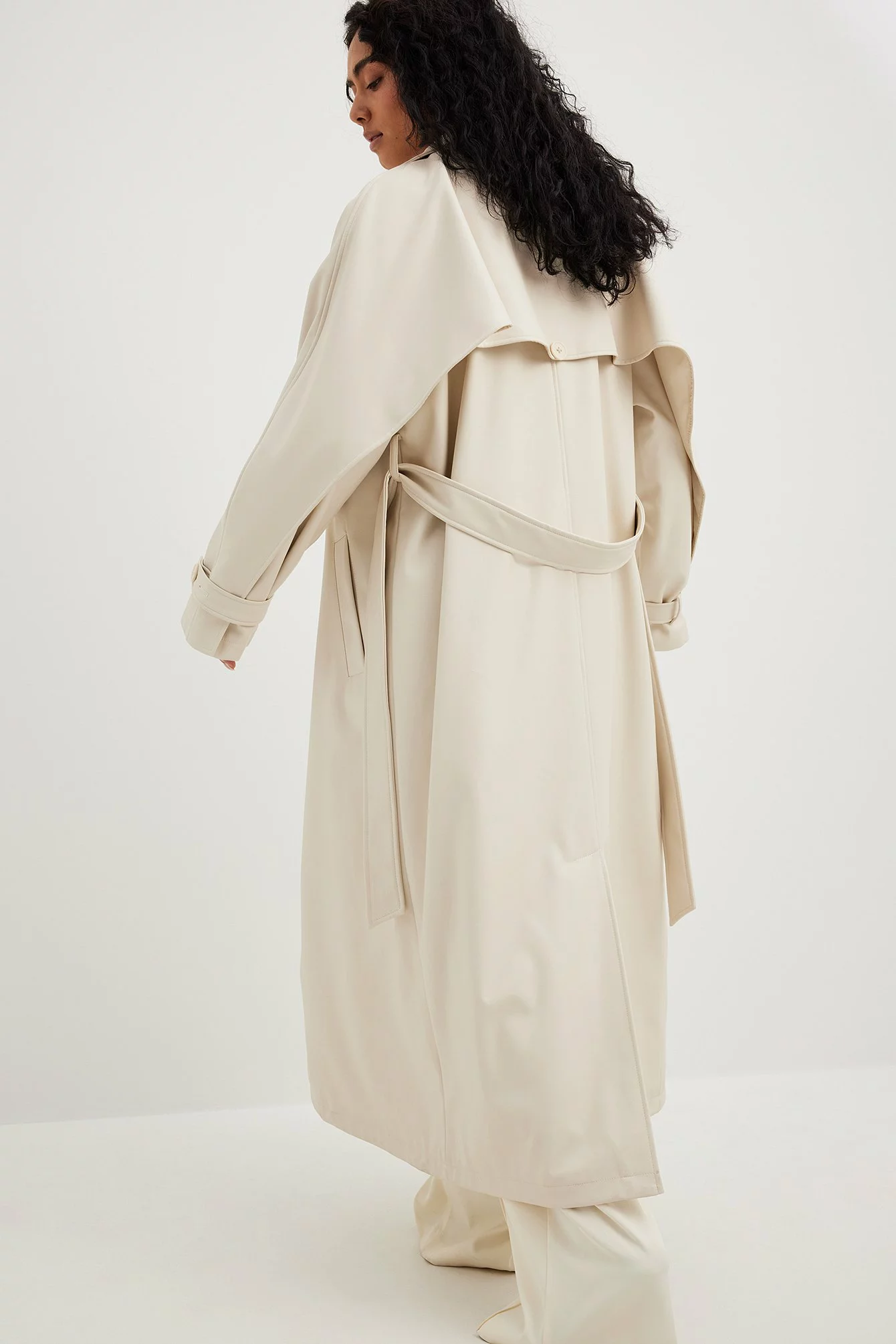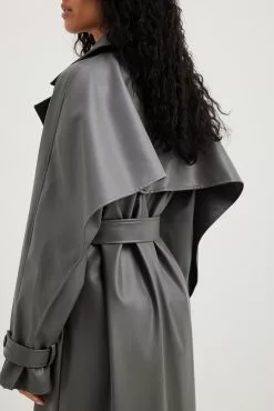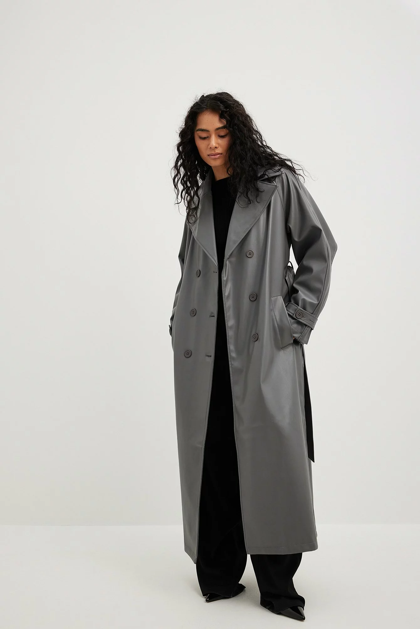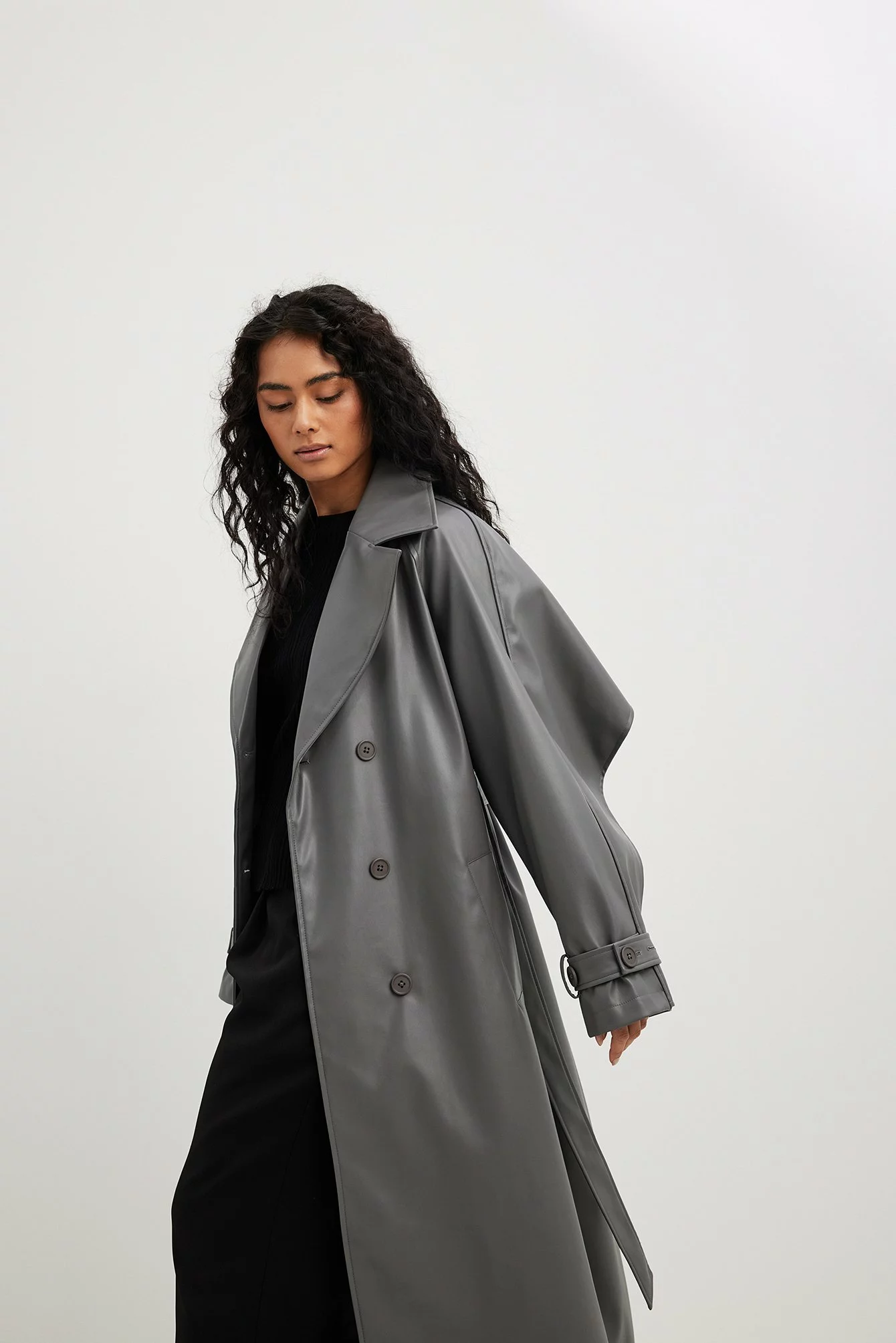 This trenchcoat features an oversized fit. It has a faux leather material and a thin fabric lining. This trenchcoat features a double-breasted button design, cuffs with an adjustable button detail, two side slanting pockets at the front, a self-tie belt at the waist, a button detail at the back and a back slit detail.