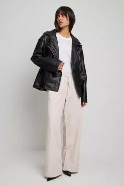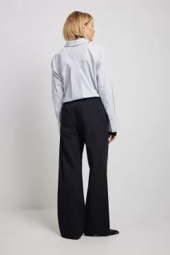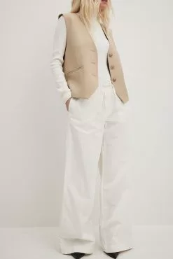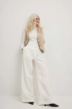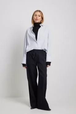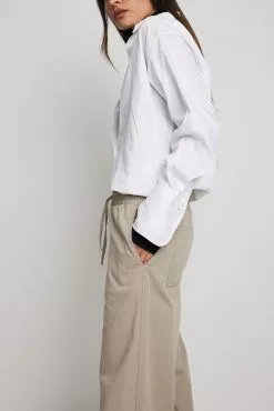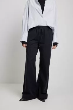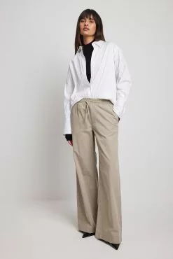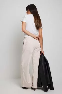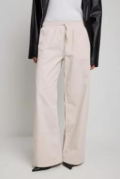 These trousers feature an elasticized waistband with a drawstring closure. They have a four-pocket design and a wide leg. These trousers feature a soft feel.