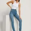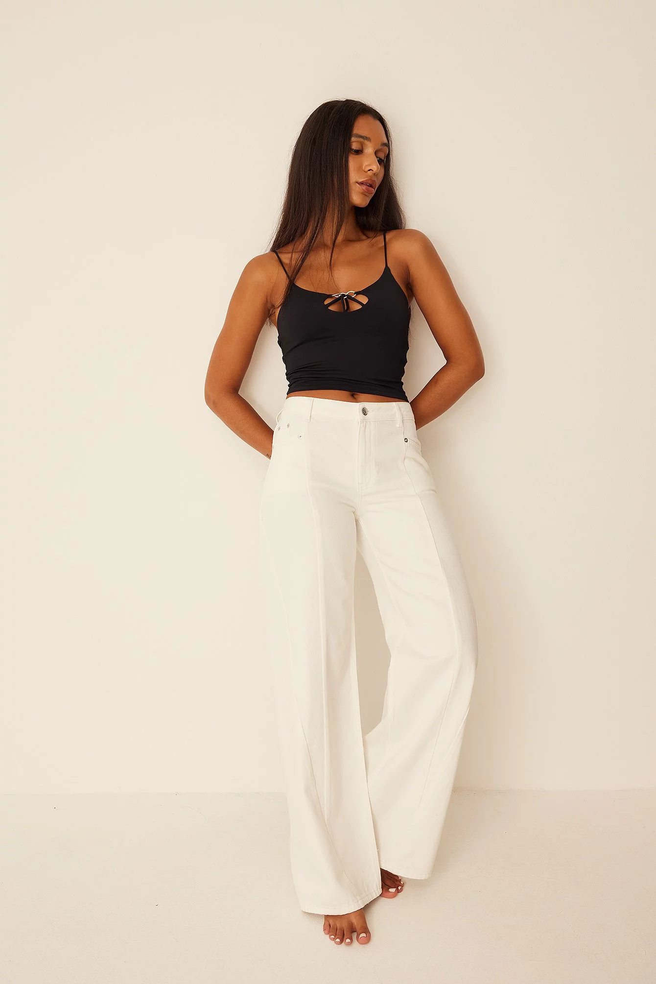 These jeans feature a mid waist with a zipper and button closure and a five-pocket design. They have a wide fit with straight legs and seam details along each leg.