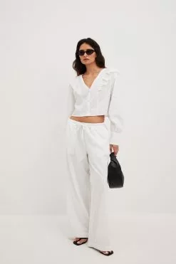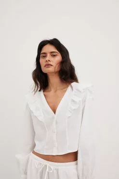 This blouse features a v neckline. It has frill details and a button closure down the front. This blouse features long balloon sleeves with button details at the cuffs.