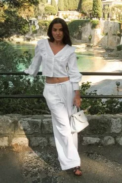 These trousers feature a wide leg. They have an elasticized waist and an adjustable drawstring. These trousers feature side slant pockets and back mock pockets.
