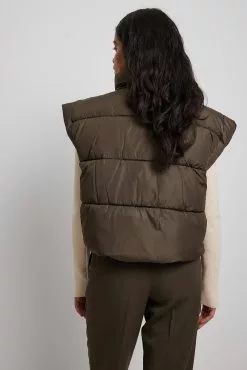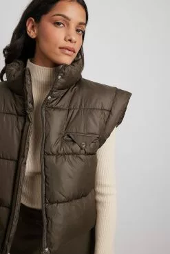 This puffer vest is cropped and features a high neck, a hidden zipper closure down the front, a chest pocket with a button closure and thick padding.