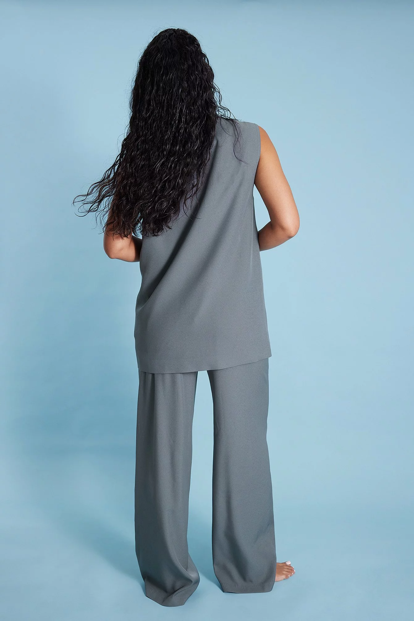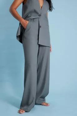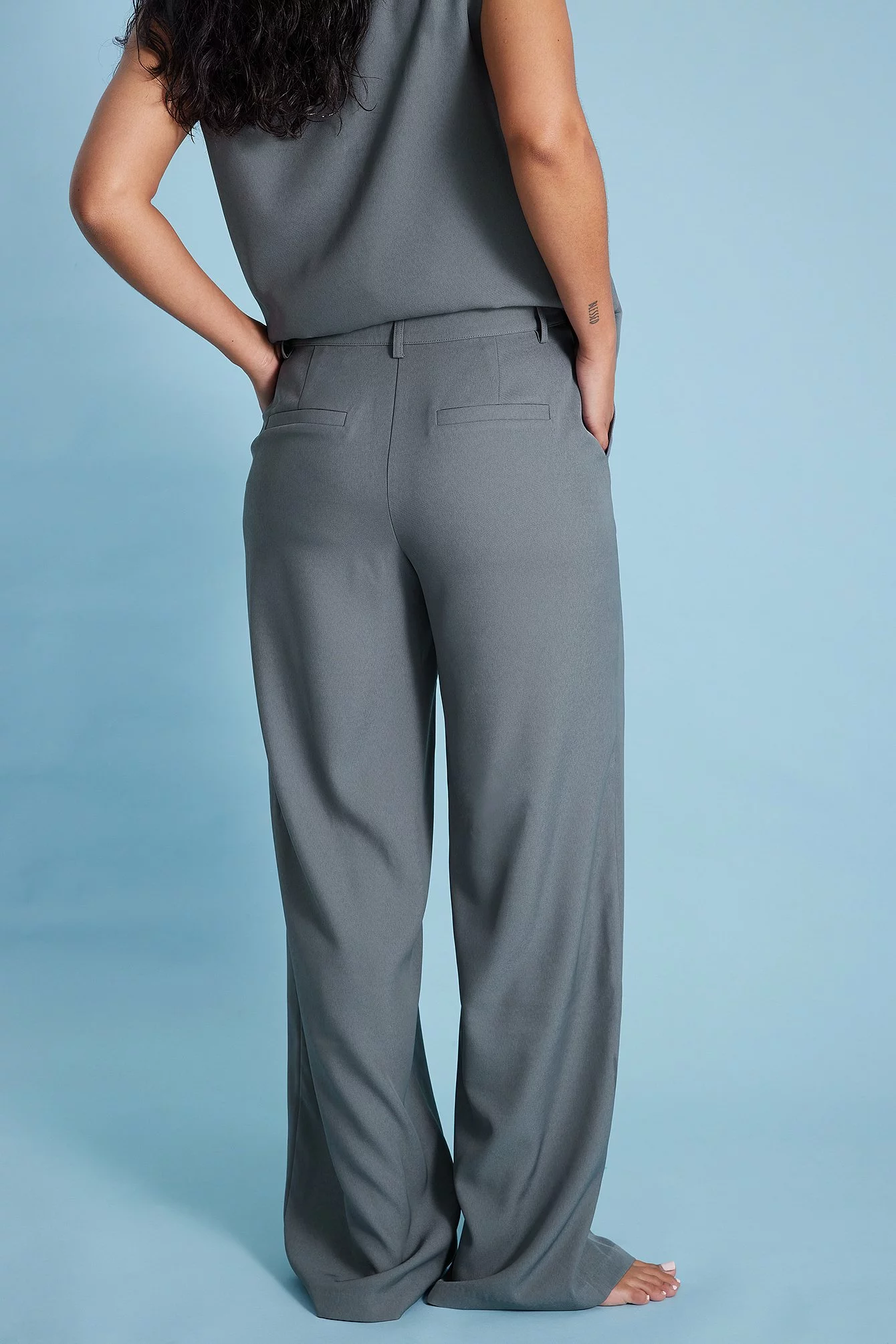 These suit pants feature a mid waist, side slanting pockets, a back mock pocket and a wide leg.