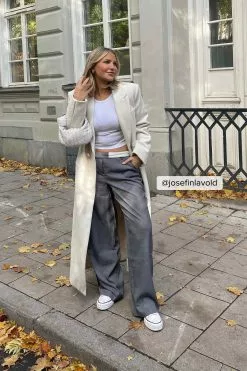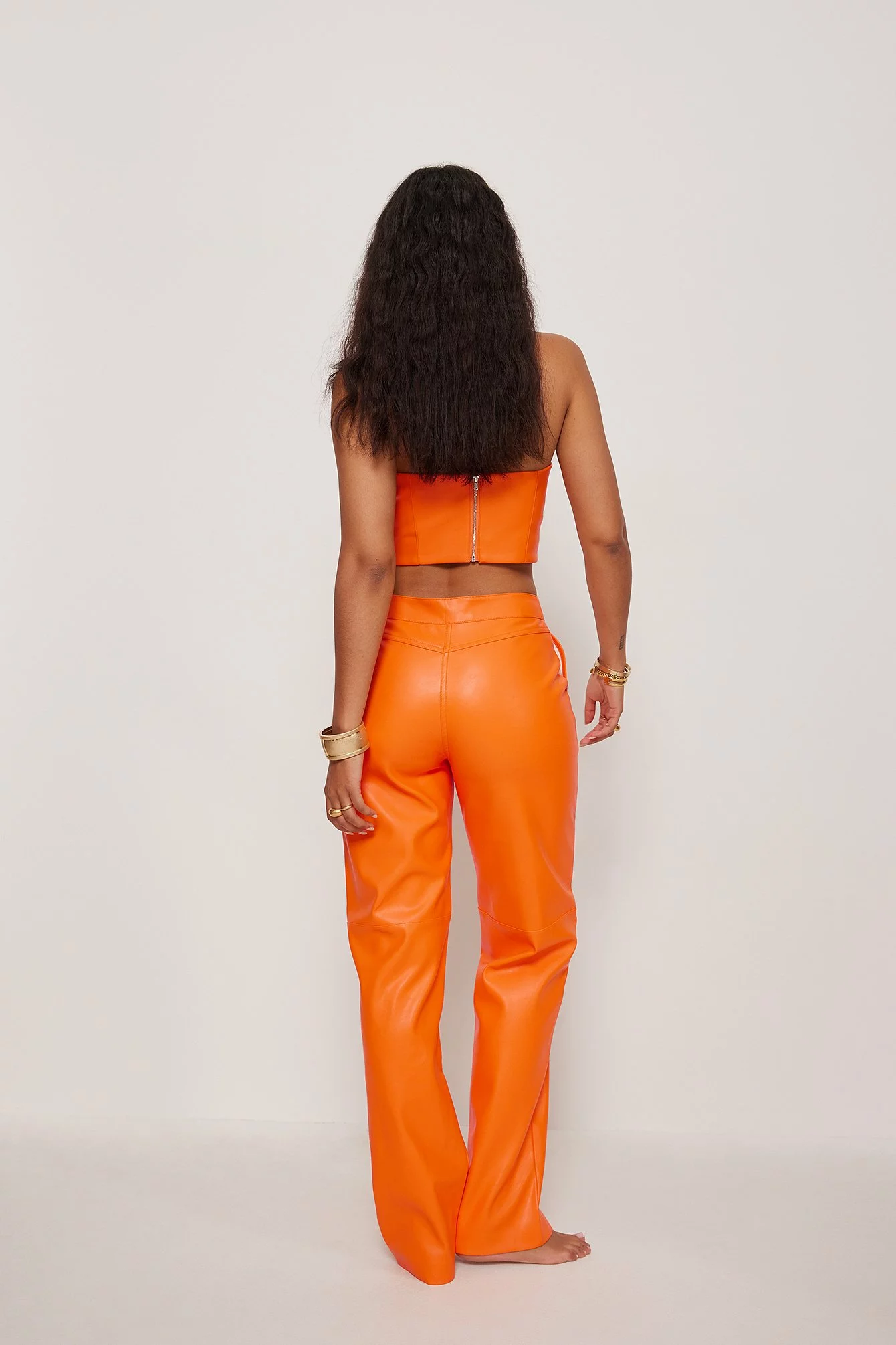 These trousers feature a PU design, a zip and button closure, a mid waist, two side pockets, two back pockets, a straight leg with seam details and a soft inside.