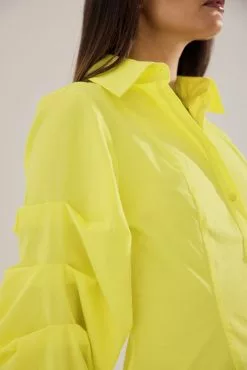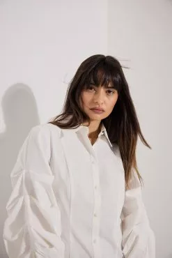 This shirt is fitted and non-stretchy and features a classic collar. It has puffy, gathered long sleeves with buttons on the cuffs and button closure.