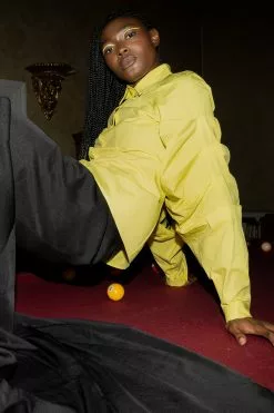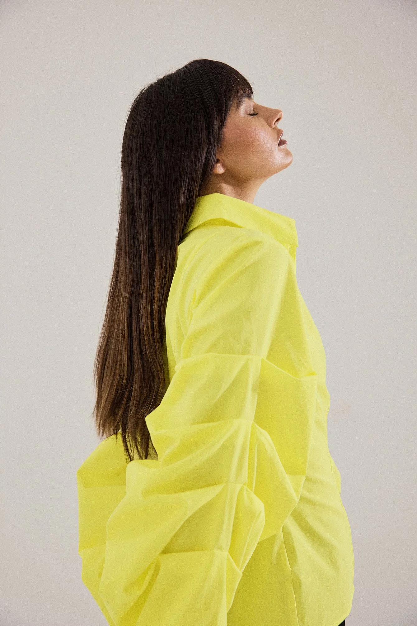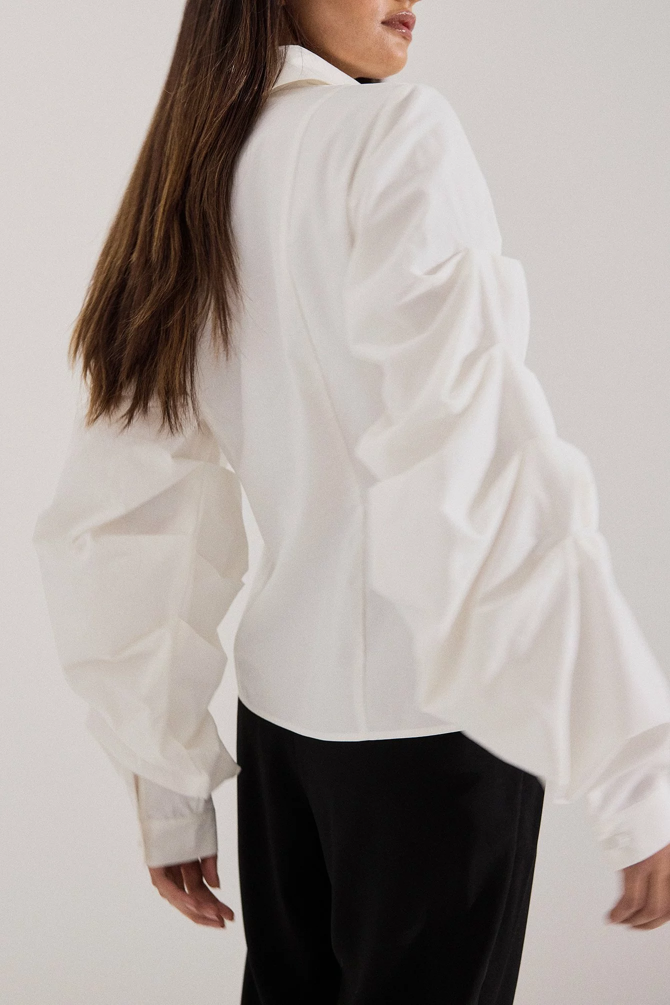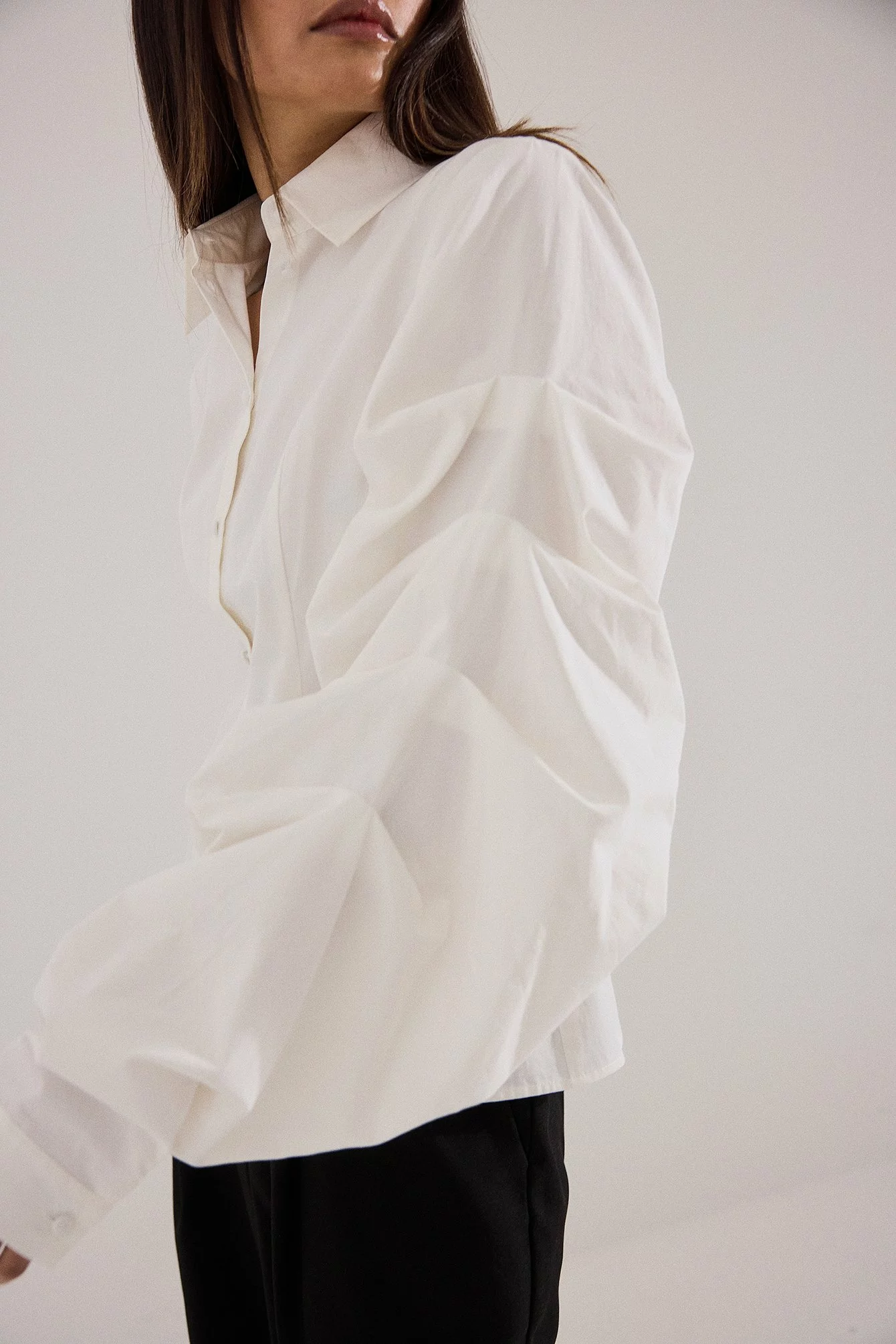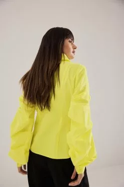 This shirt is fitted and non-stretchy and features a classic collar. It has puffy, gathered long sleeves with buttons on the cuffs and button closure.