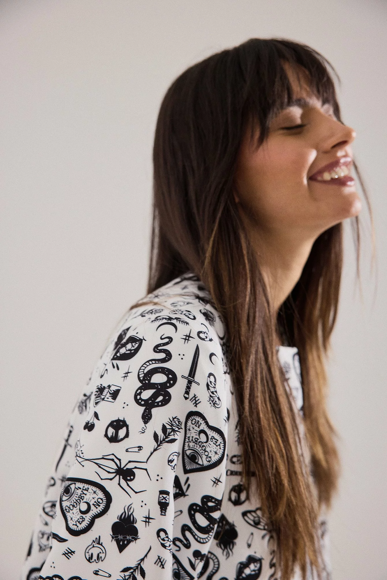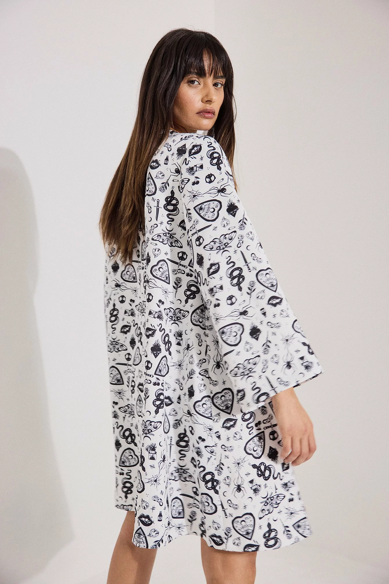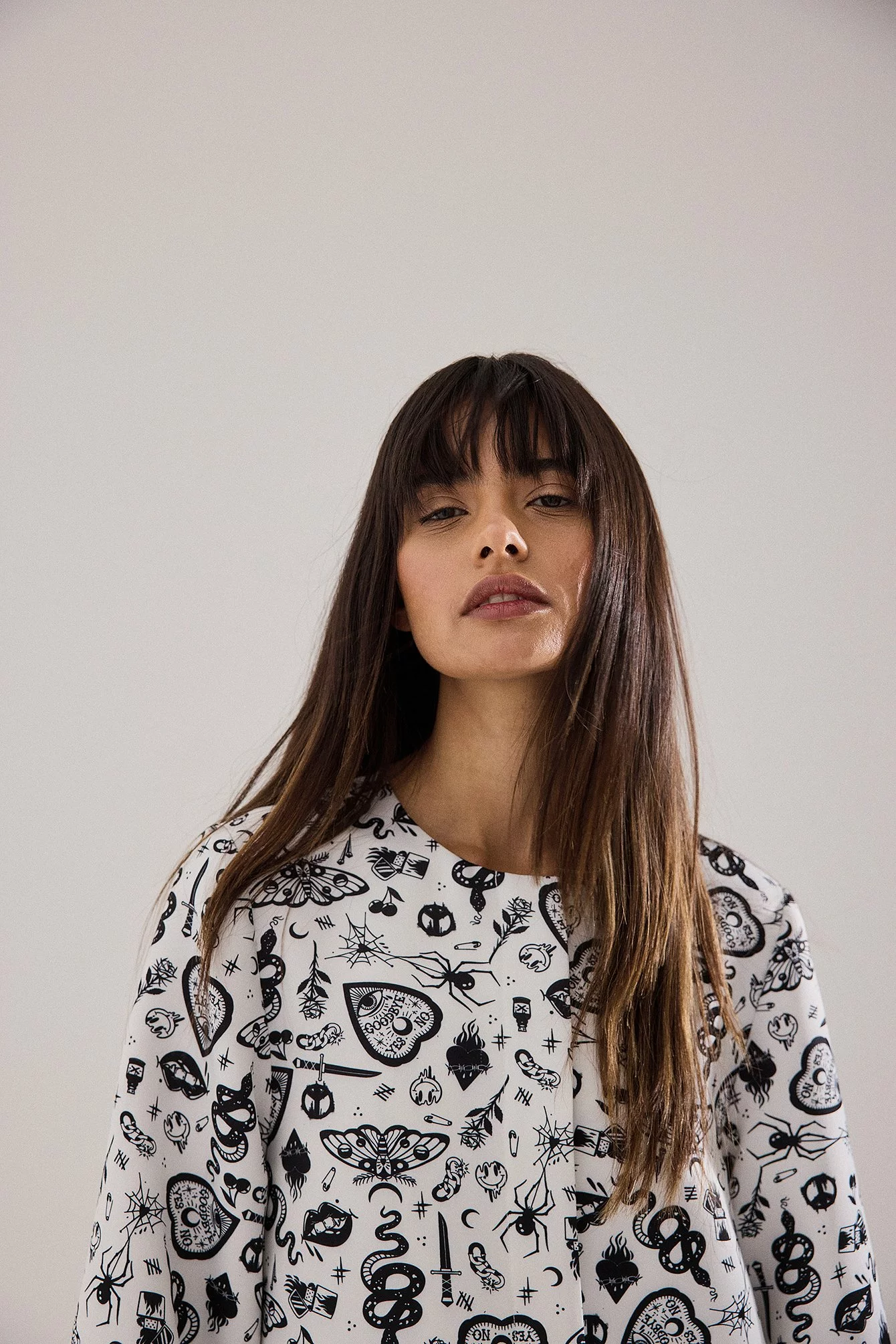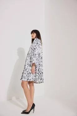 This jacket is lined and features a satin touch. It has a printed pattern and a hidden button closure. This jacket features side pockets.