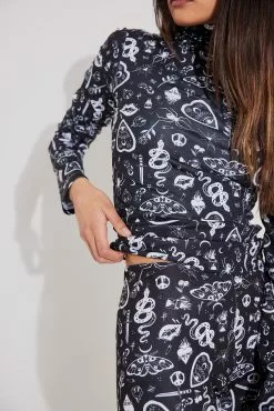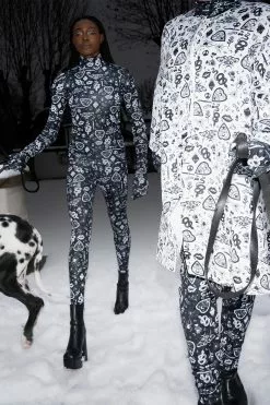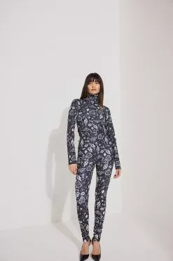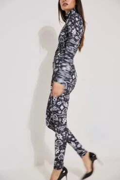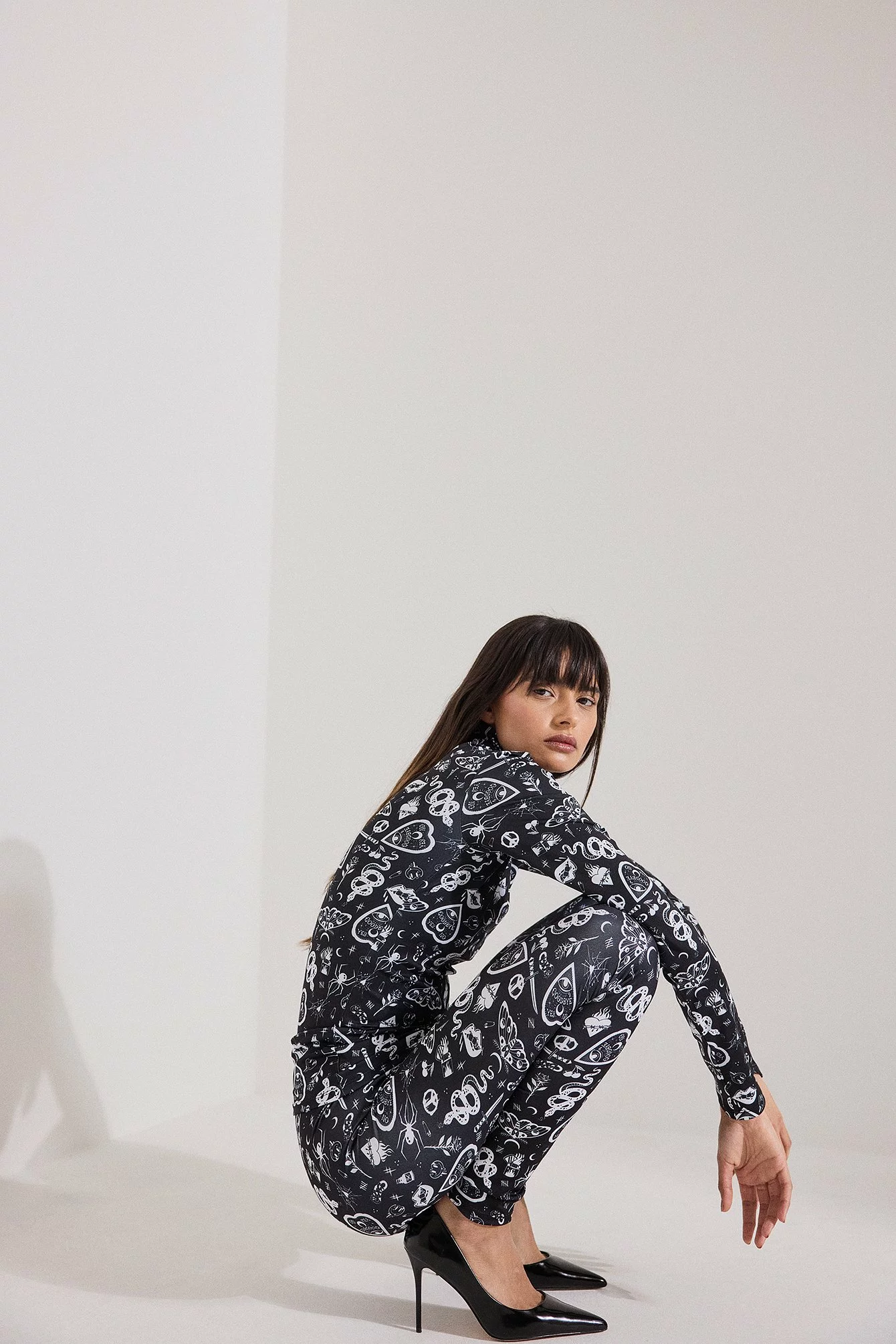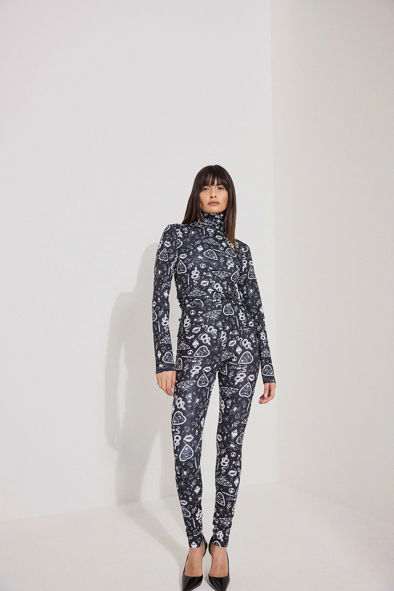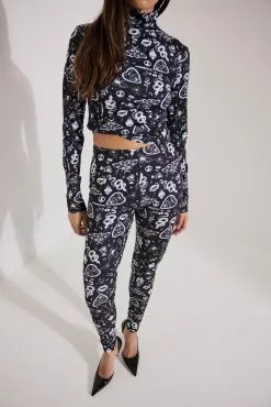 These leggings are stretchy and feature a printed pattern. They have a mid waist with an elasticized waistband.