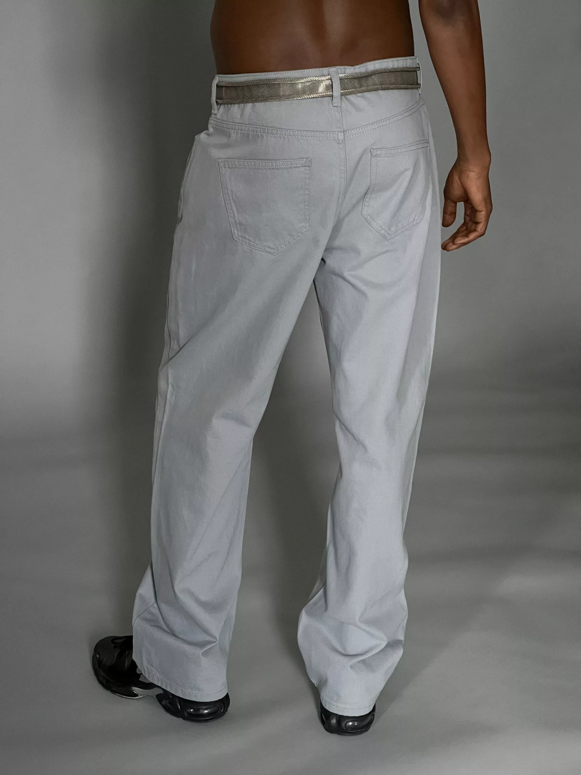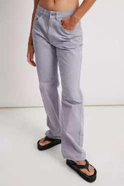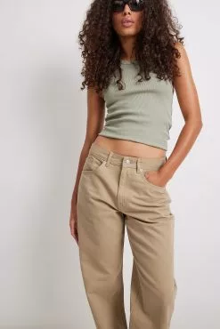 These jeans feature a low waist, a five-pocket design, a zip and button closure and a wide leg.