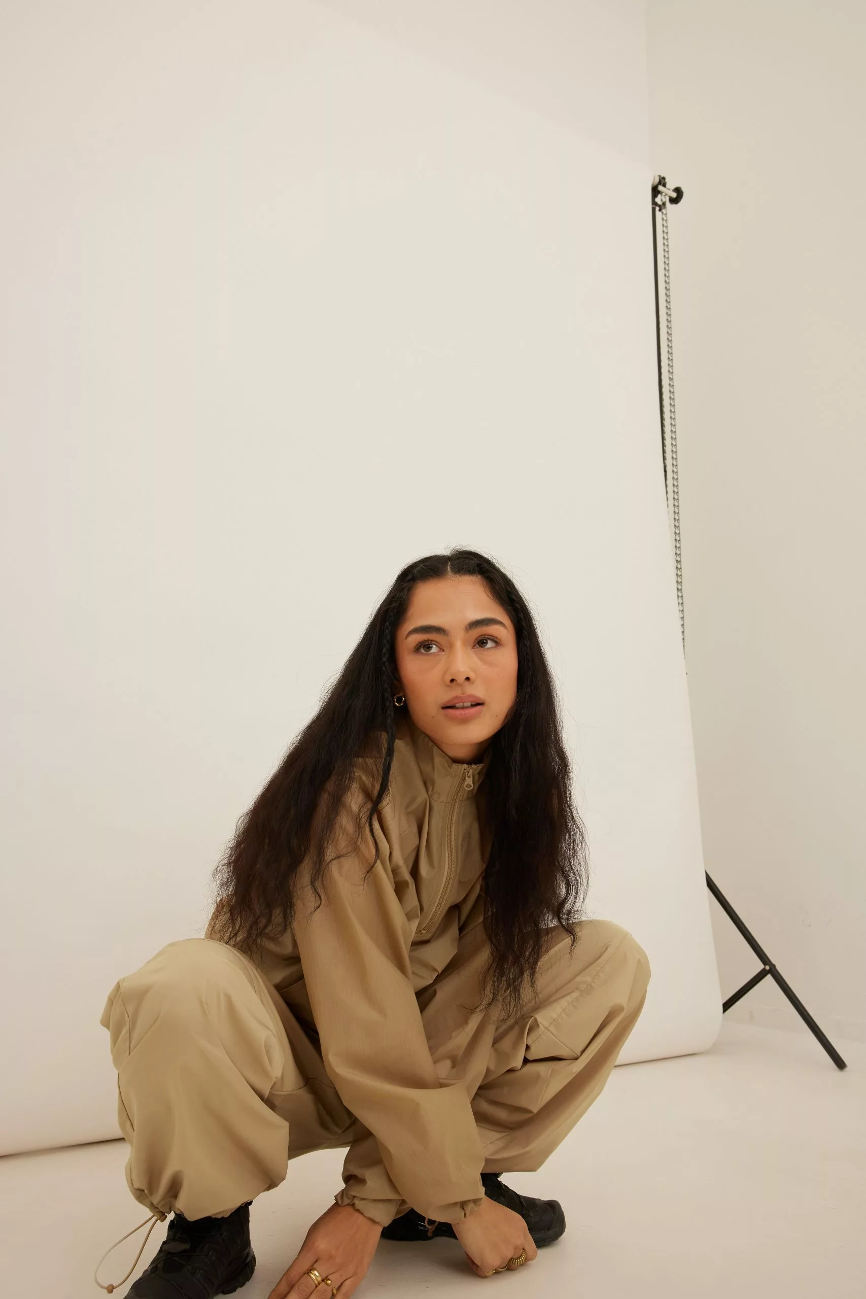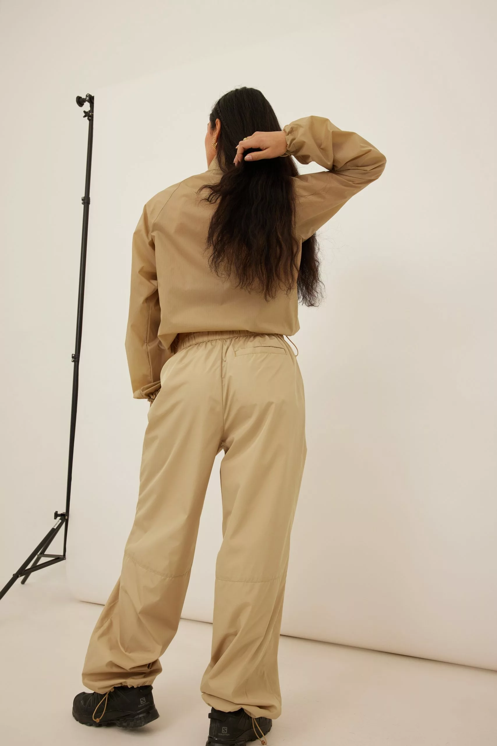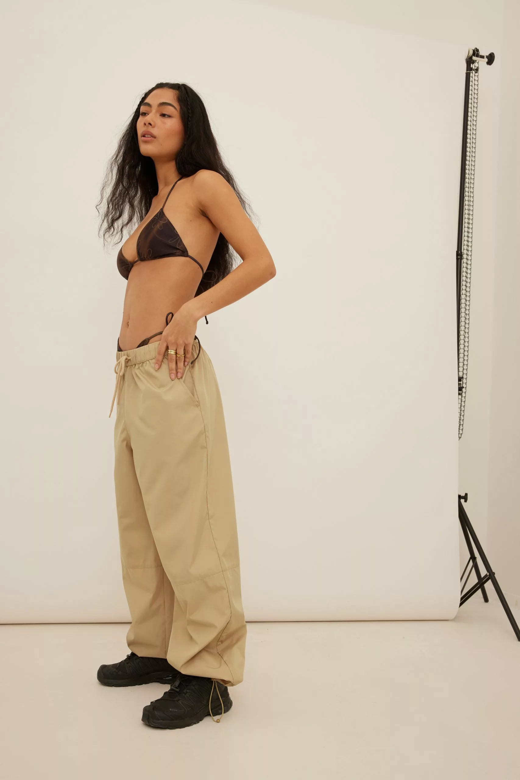 These pants feature an oversized fit, an elasticized drawstring waistband, side pockets, wide legs with a drawstring detail on the bottom hem and a functional material.