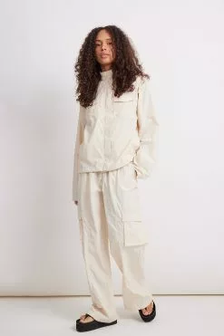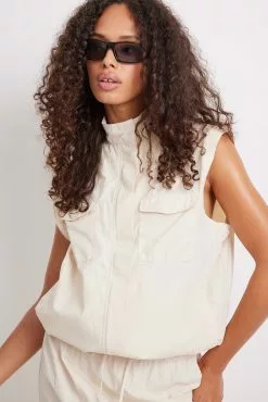 This jacket features detachable sleeves, chest pockets, side pockets, a high neck with snap button closures and drawstrings on the bottom hem.