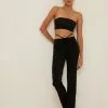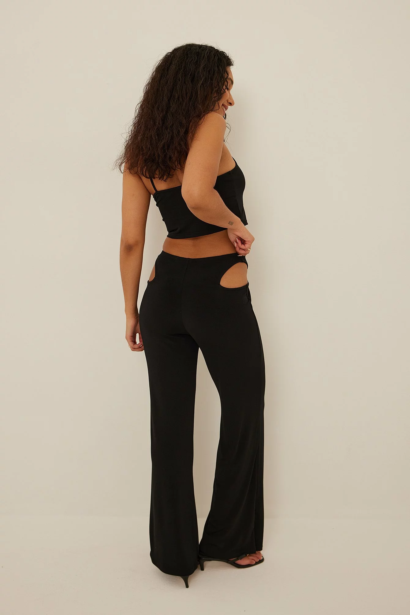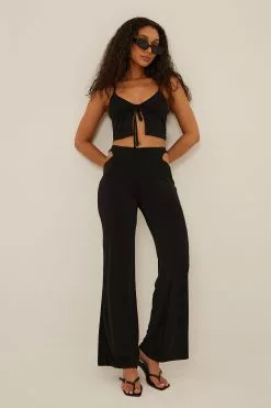 These pants feature cut out details at the waist, a stretchy material in jersey with an elasticized waist and wide legs.