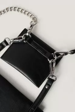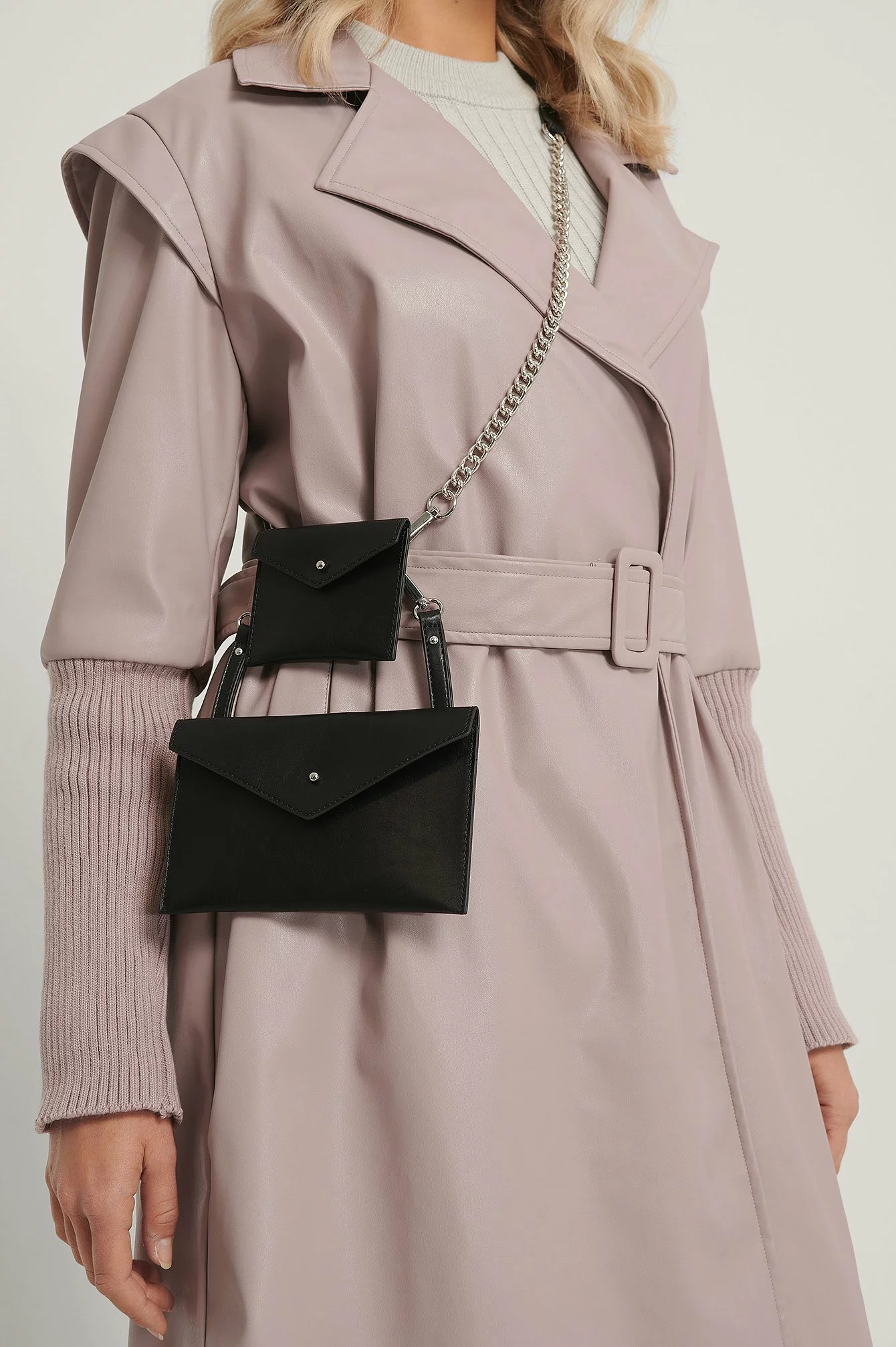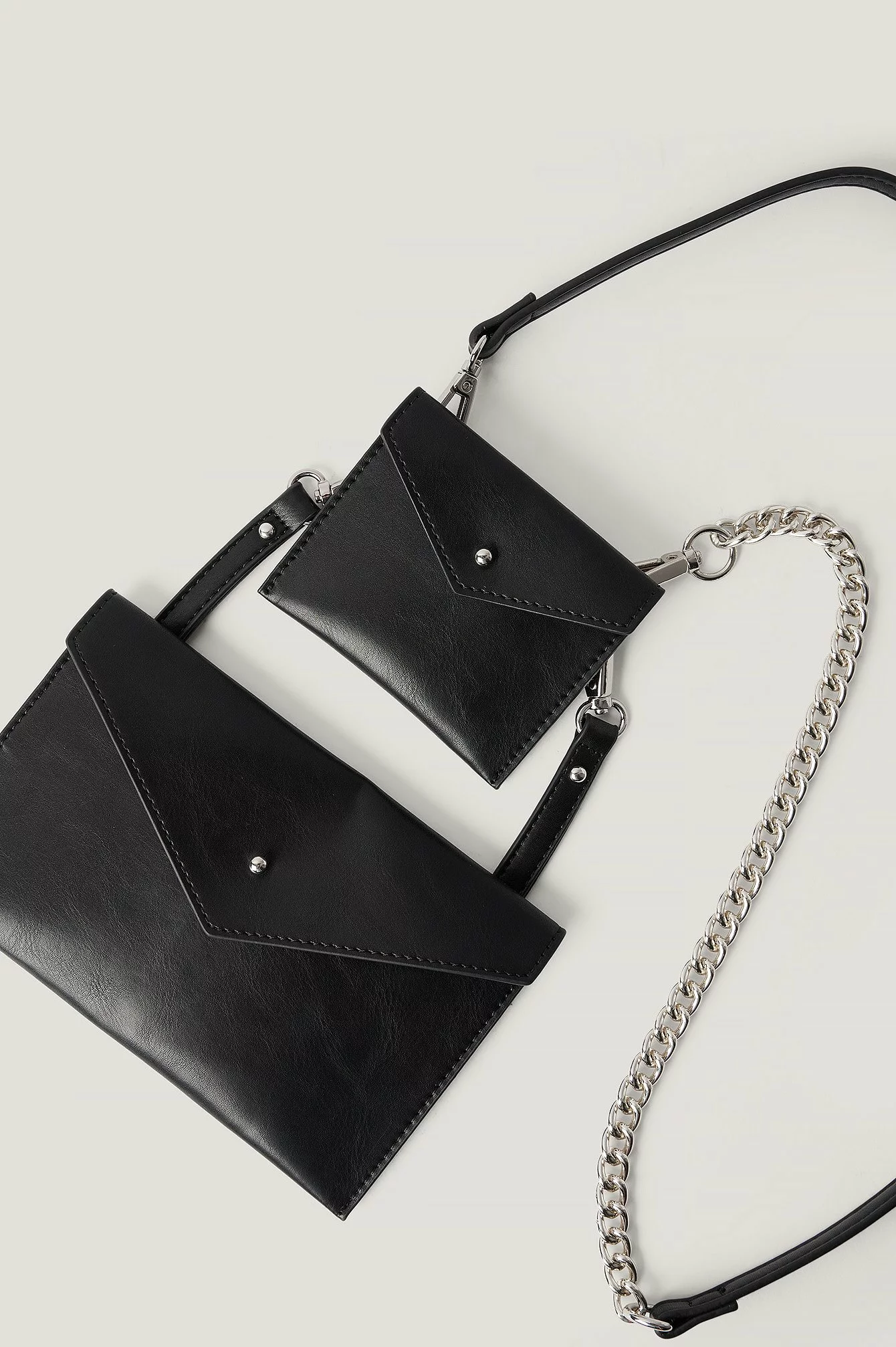 This double purse bag is different-sized and features two removable purses with a closure on the front and a removable strap in PU with a chain detail.