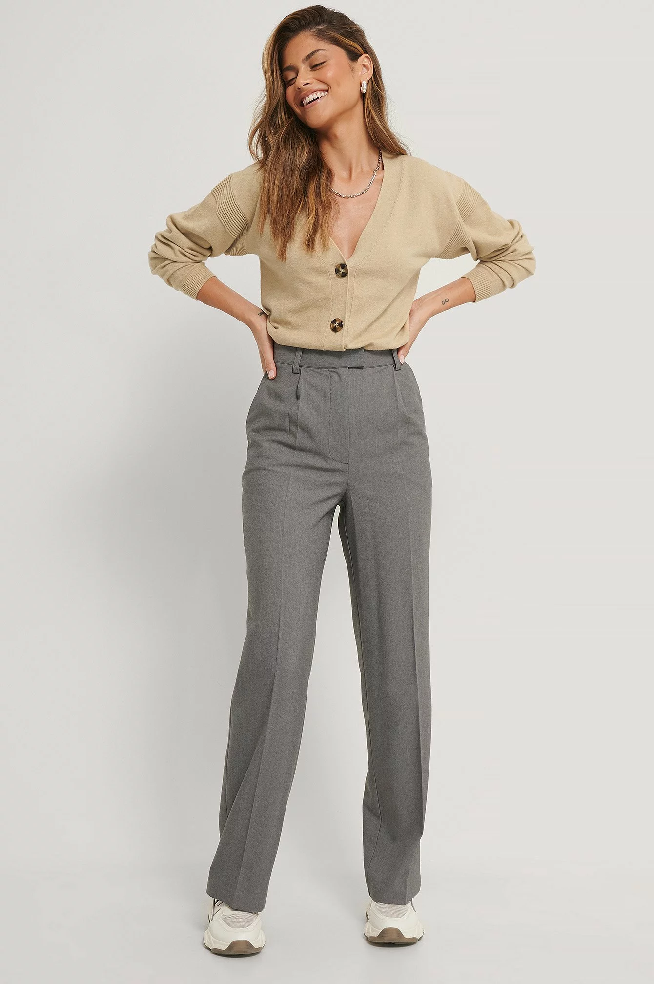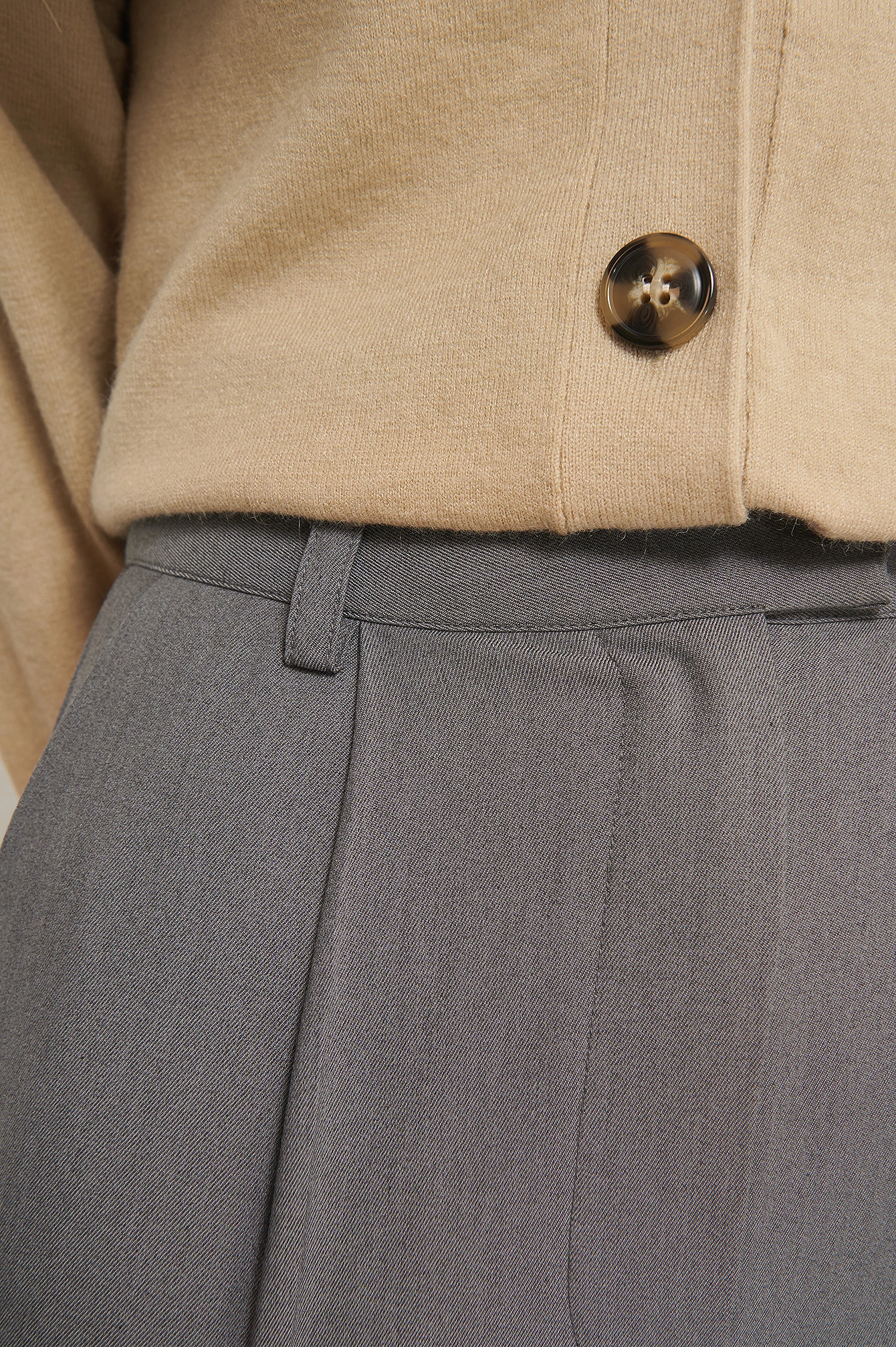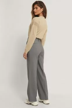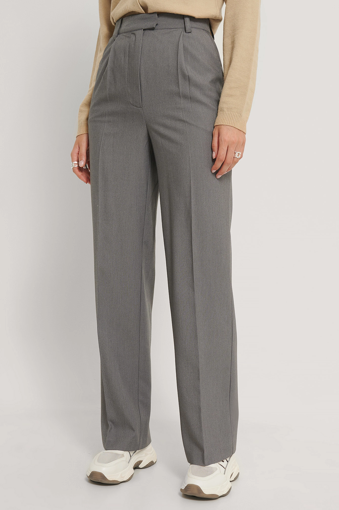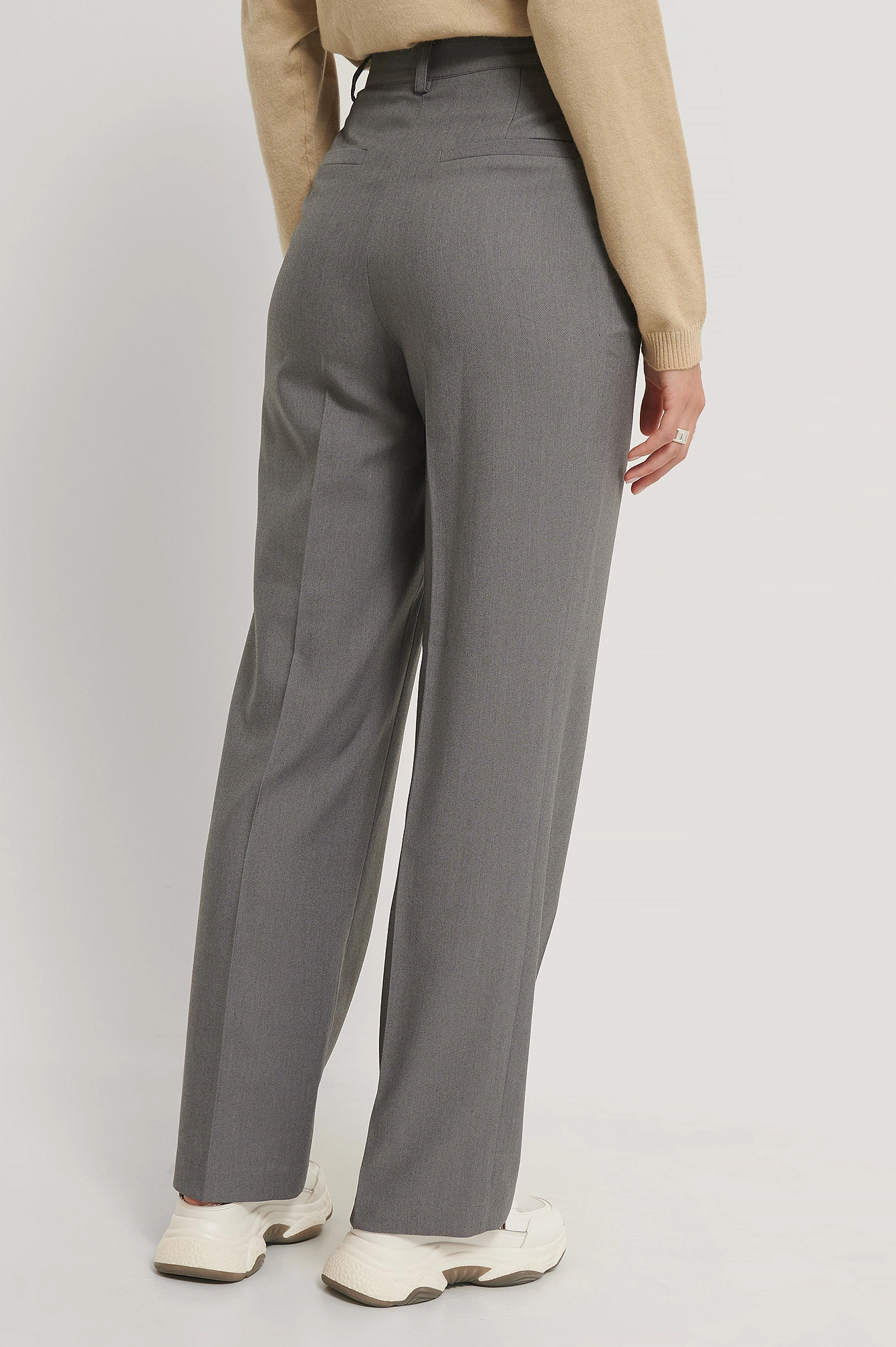 These suit pants feature a high waist with a hidden zipper, hook and button closure, pleated details on the front and on the back, two side slanting pockets on the front, two mock pockets on the back and a long length with slightly, wide hems.
