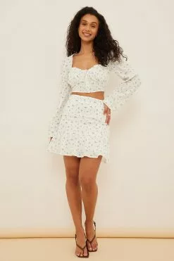 This blouse is made of organic cotton and features a sweetheart neckline with gathered cups. It has long balloon sleeves and a hidden button closure down the front. This blouse features cropped length.