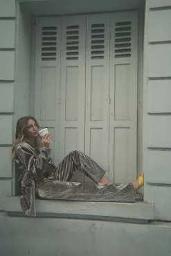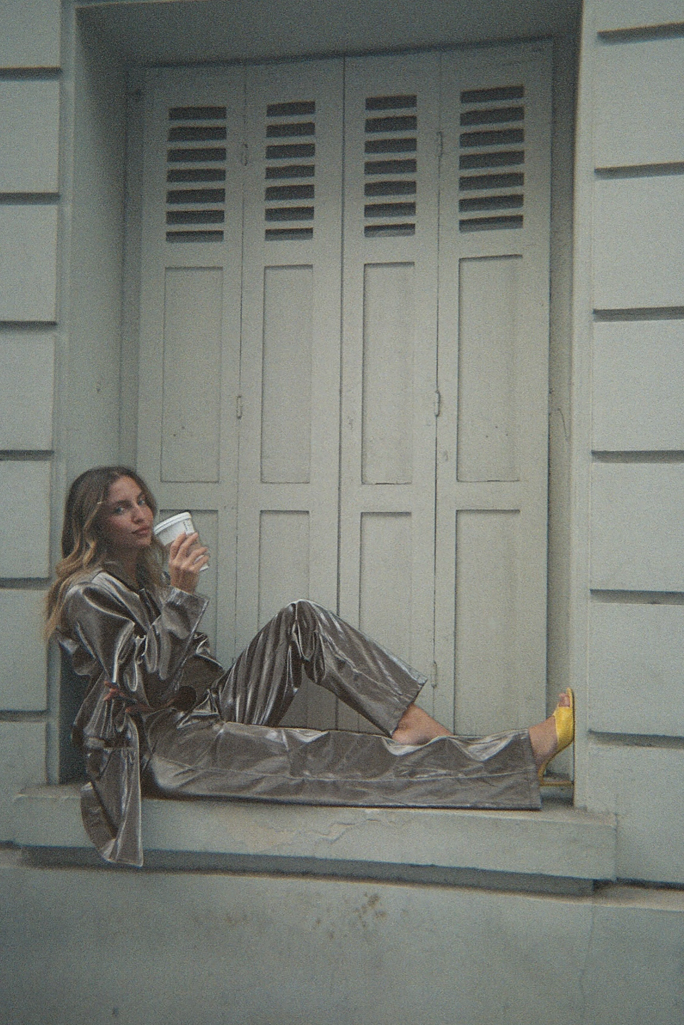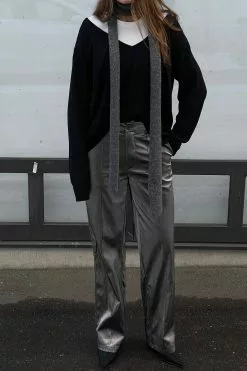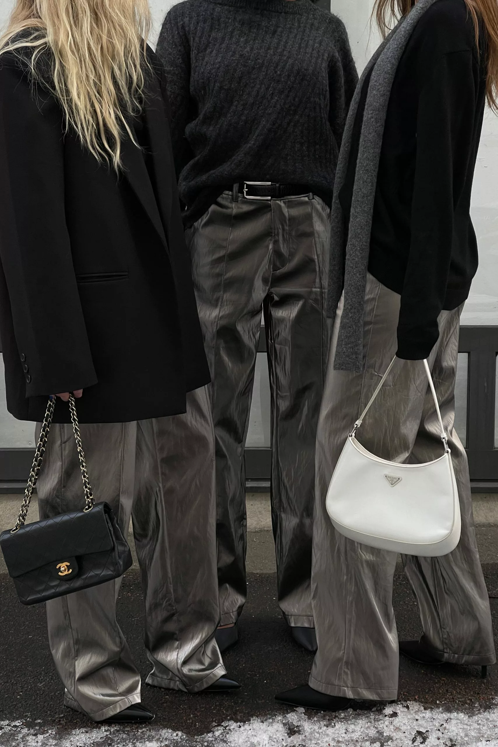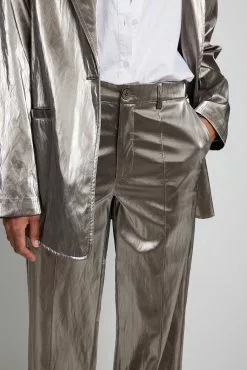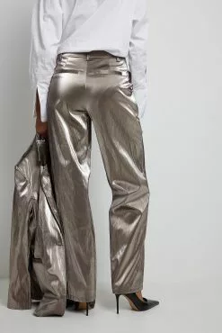 These trousers feature a mid waist with a zip and button closure, two side slanting pockets, two mock pockets on the back, a straight leg with a front seam detail and a shiny patent design.