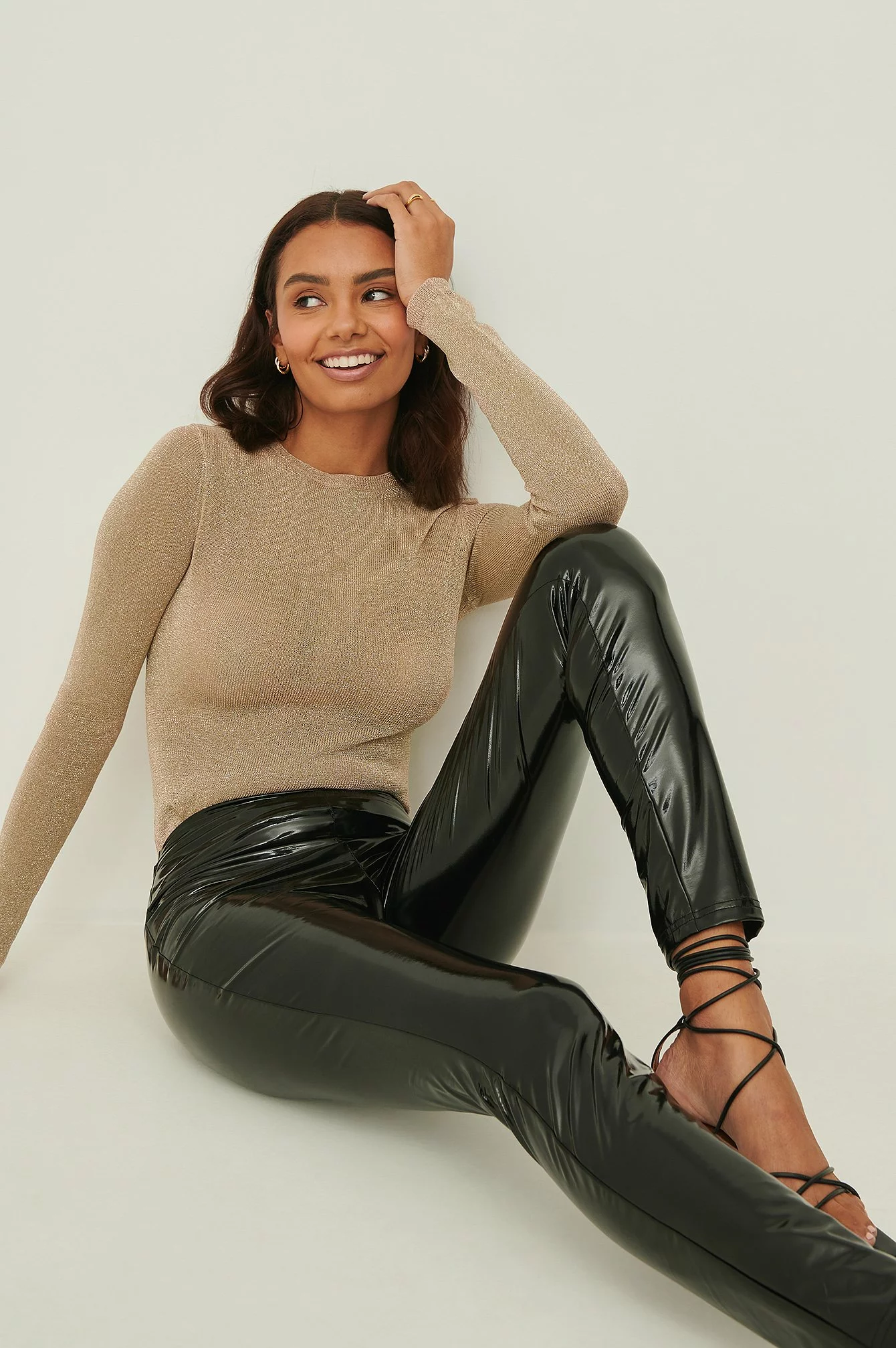 These leggings feature a high waist, a zipper closure on the side and a shiny material in PU.
