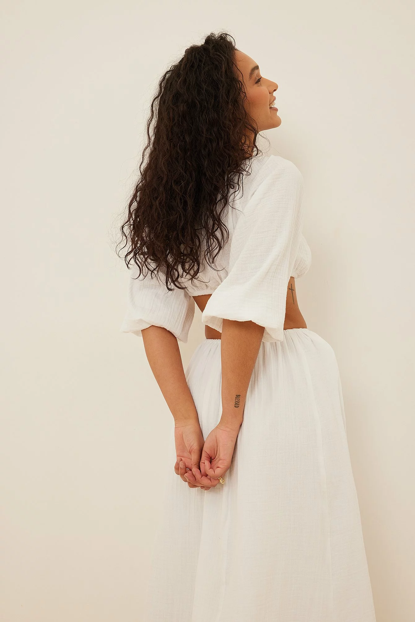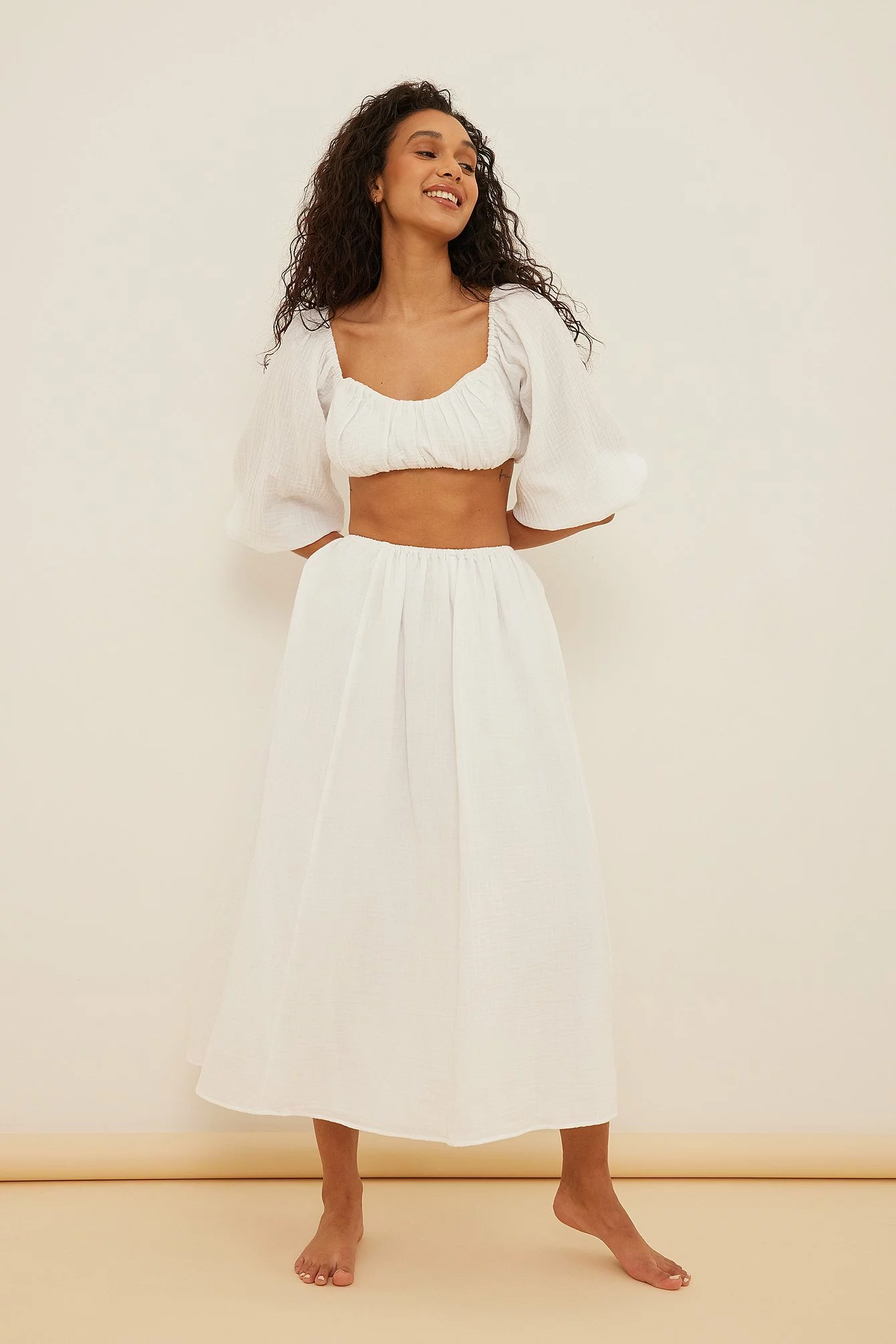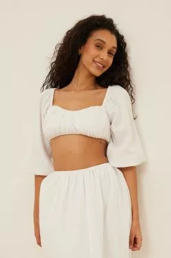 This blouse is cropped and features an elasticized heart-shaped neckline. It has puffy, off-the-shoulder long sleeves and an elasticized waistband.