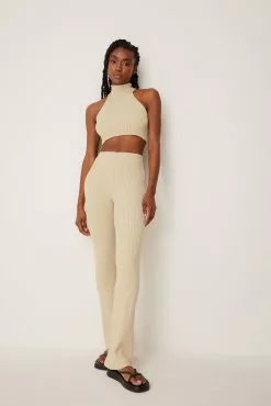 These pants feature an elasticized waistband, a high waist, straight legs and a stretchy, soft, ribbed knit material.