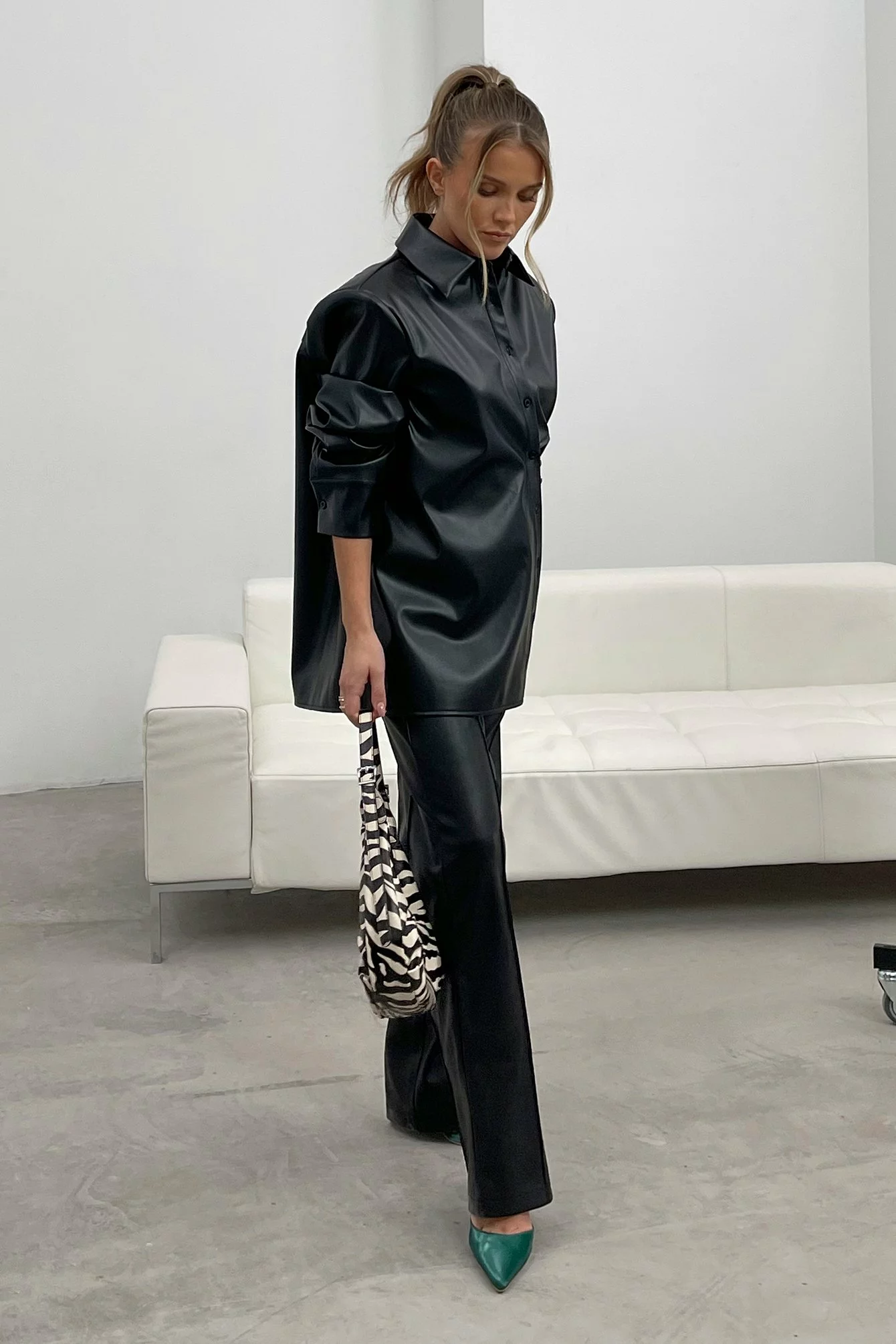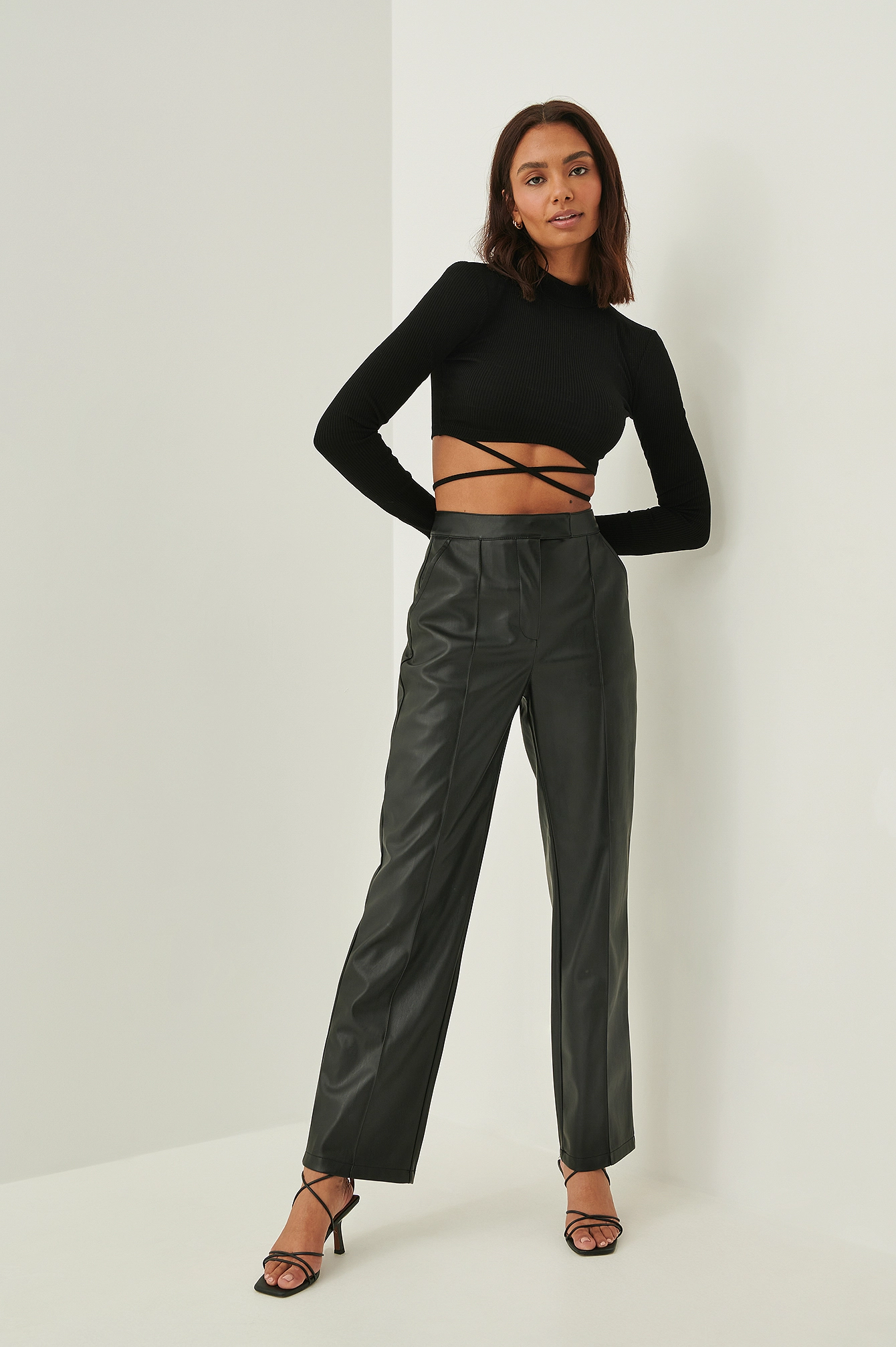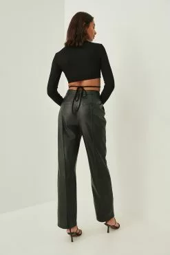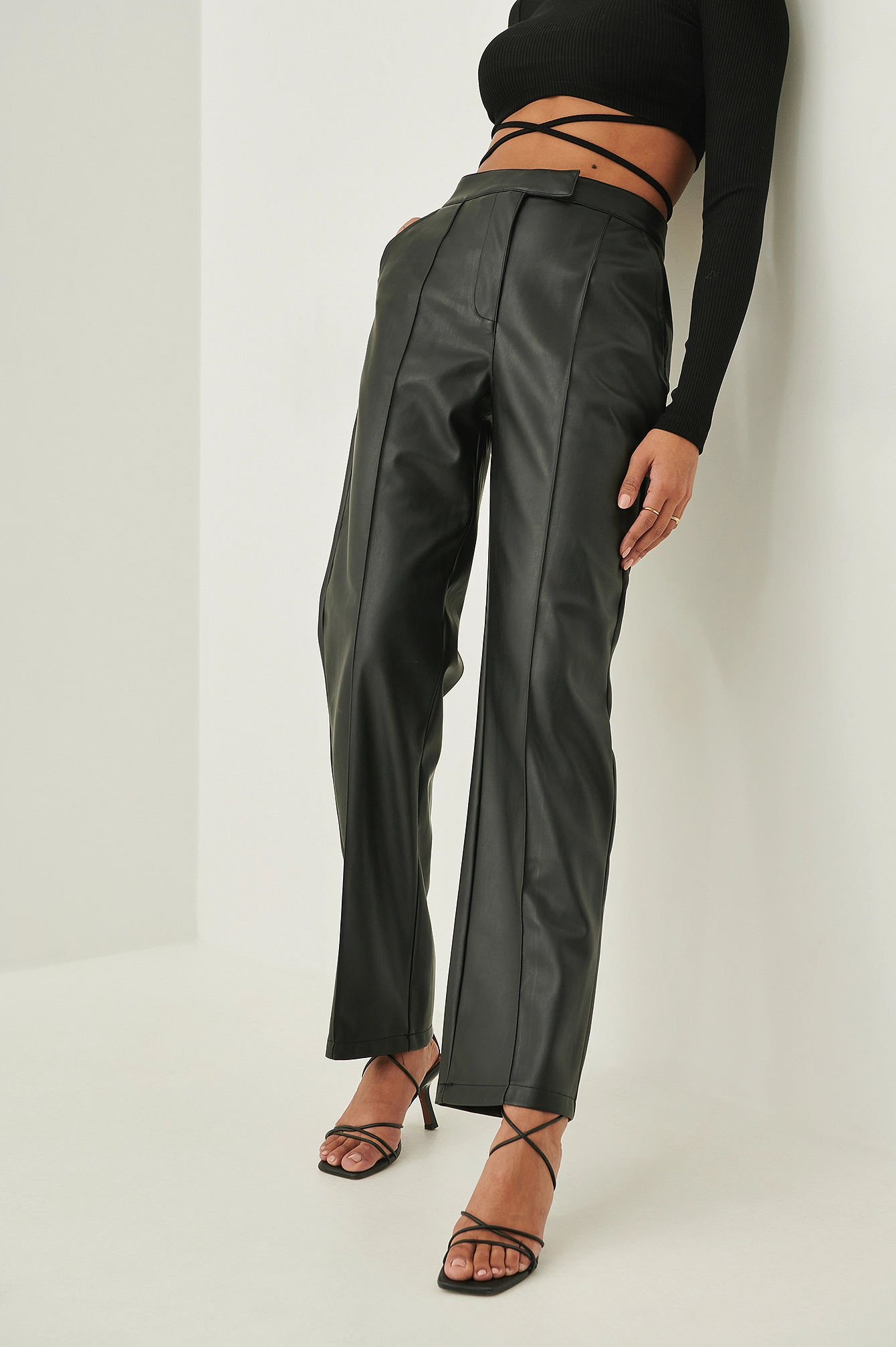 These pants feature a high waist, side slanting pockets, a zipper, hook and button closure, a straight leg, seam details, back mock pockets and a material in PU.