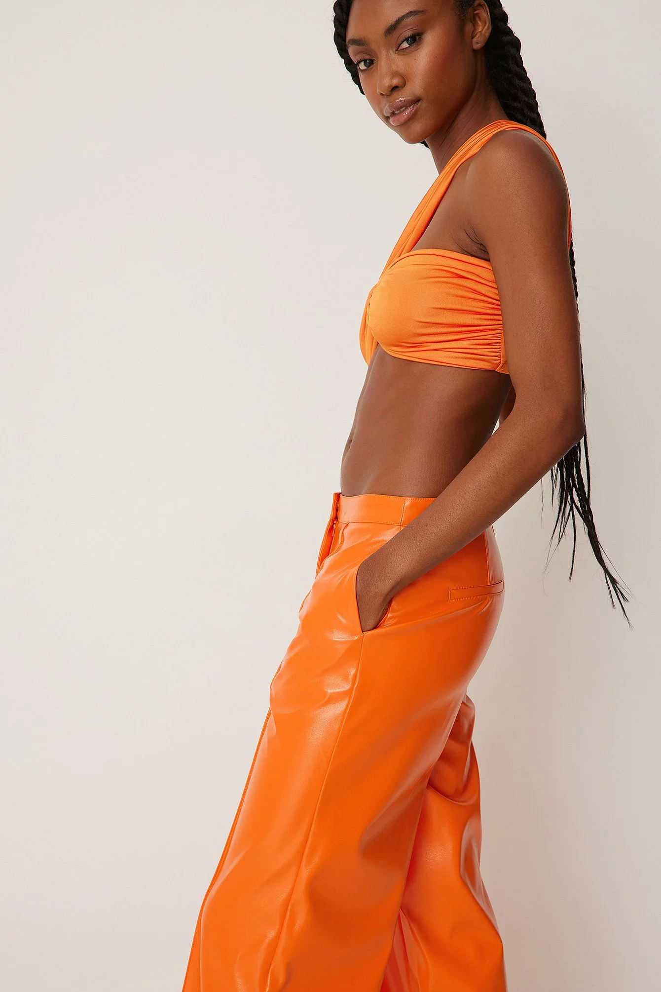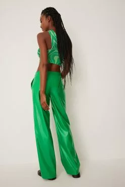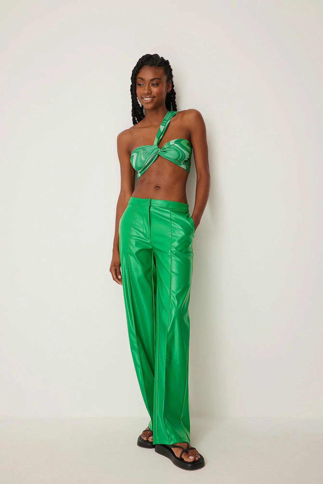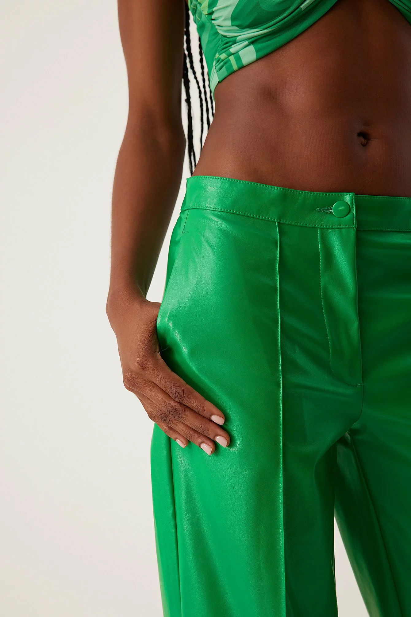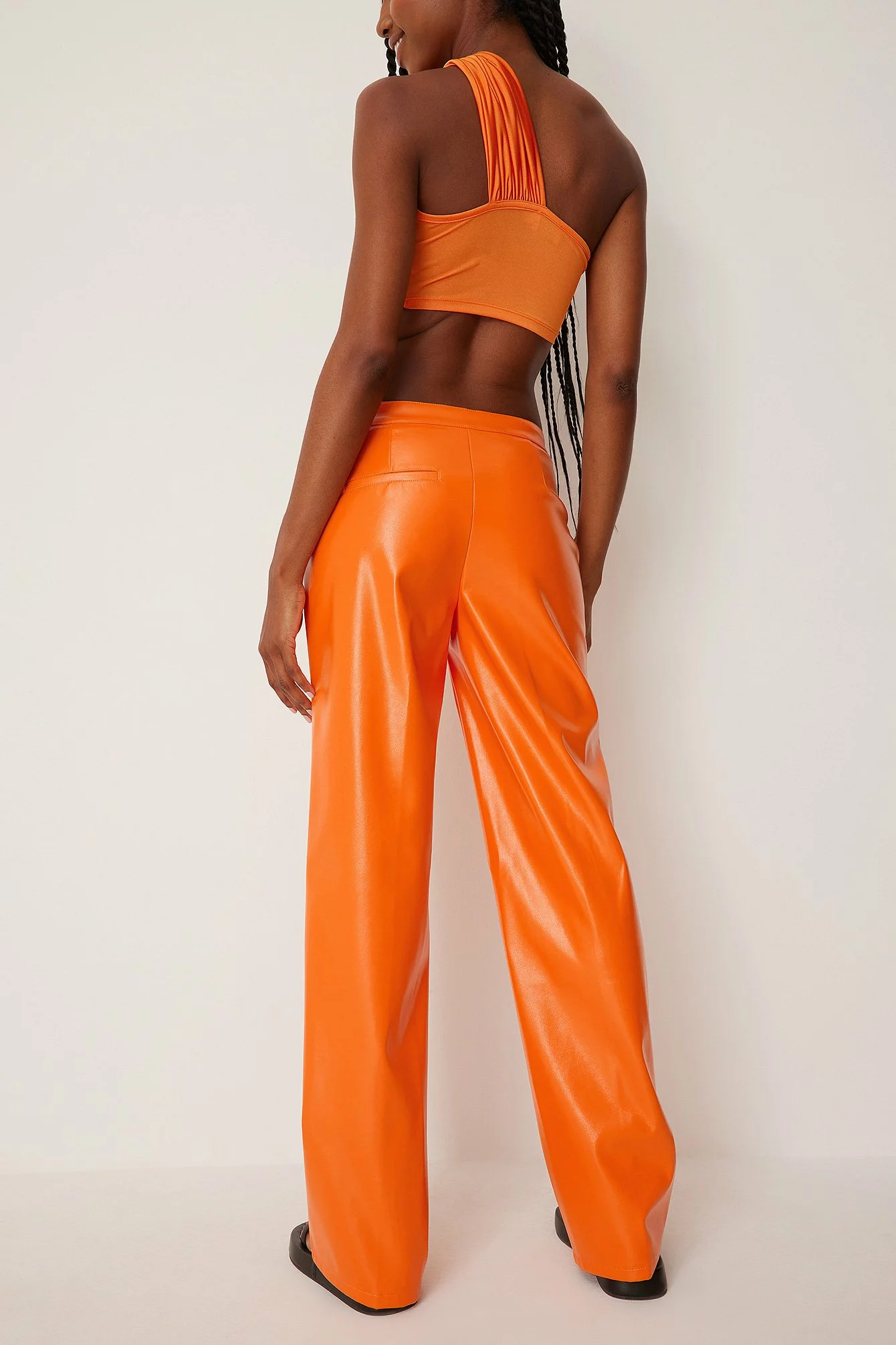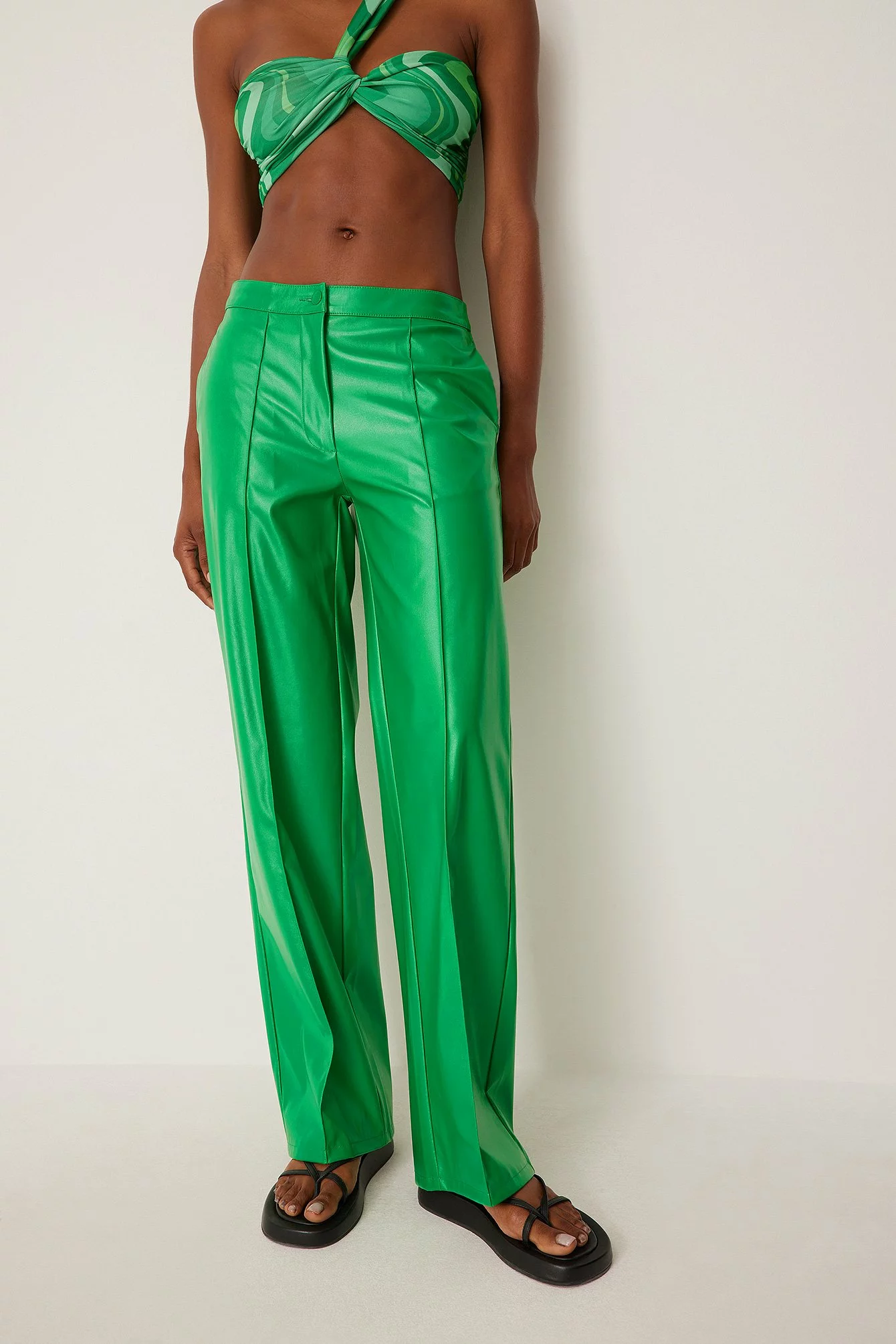 These trousers feature a zipper and button closure, front pockets, a back mock pocket, a shiny material in PU and a straight fit.