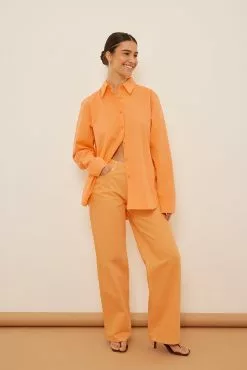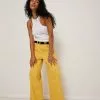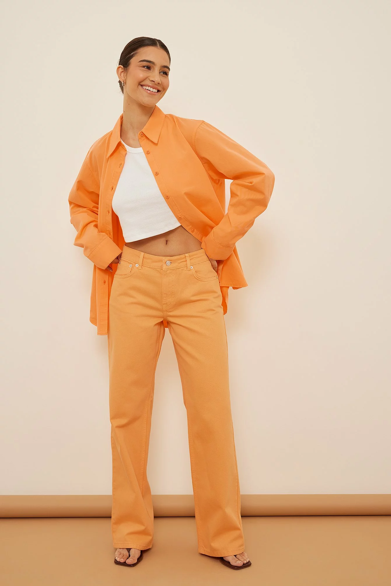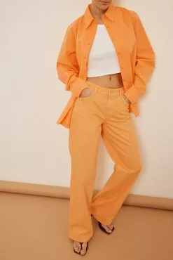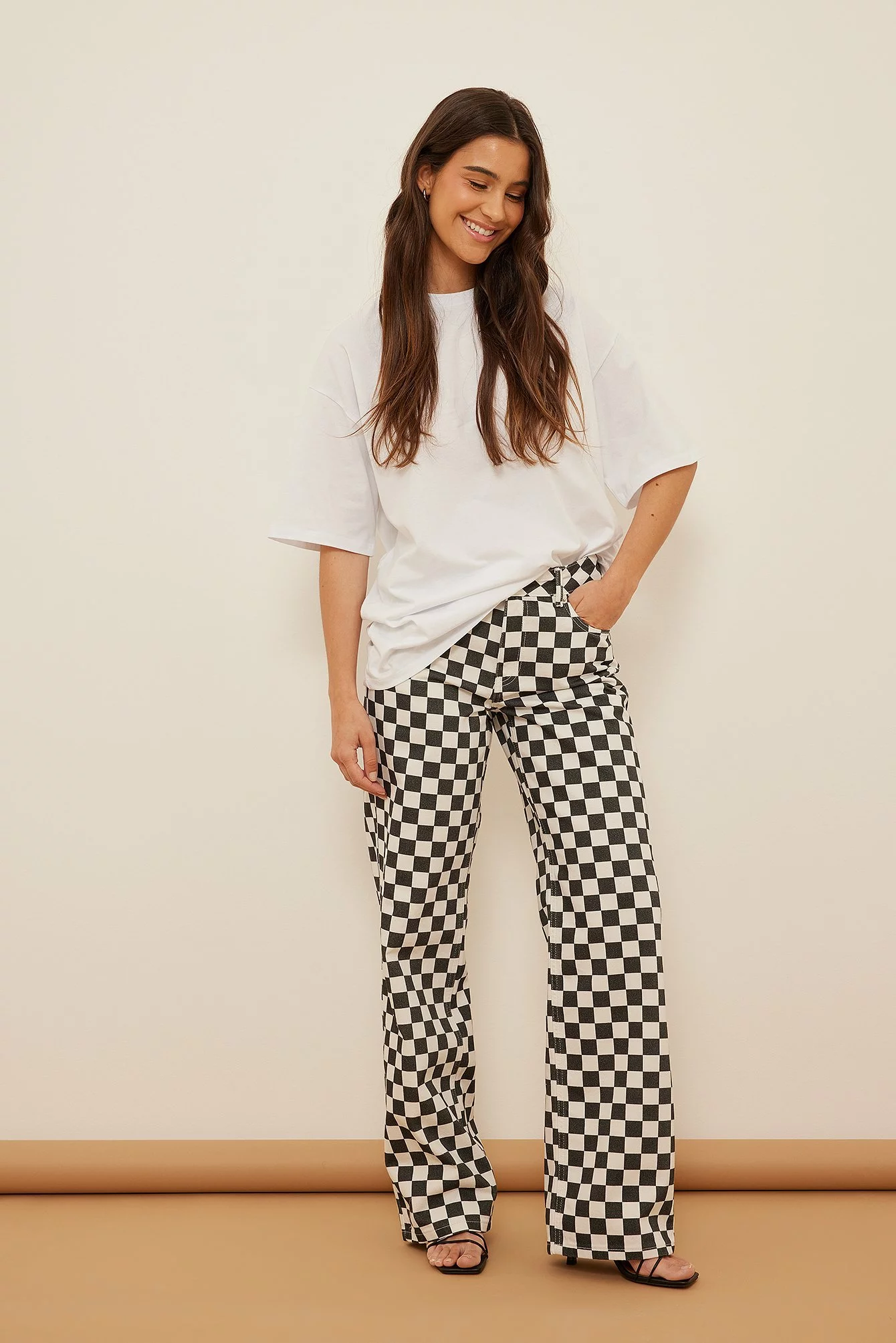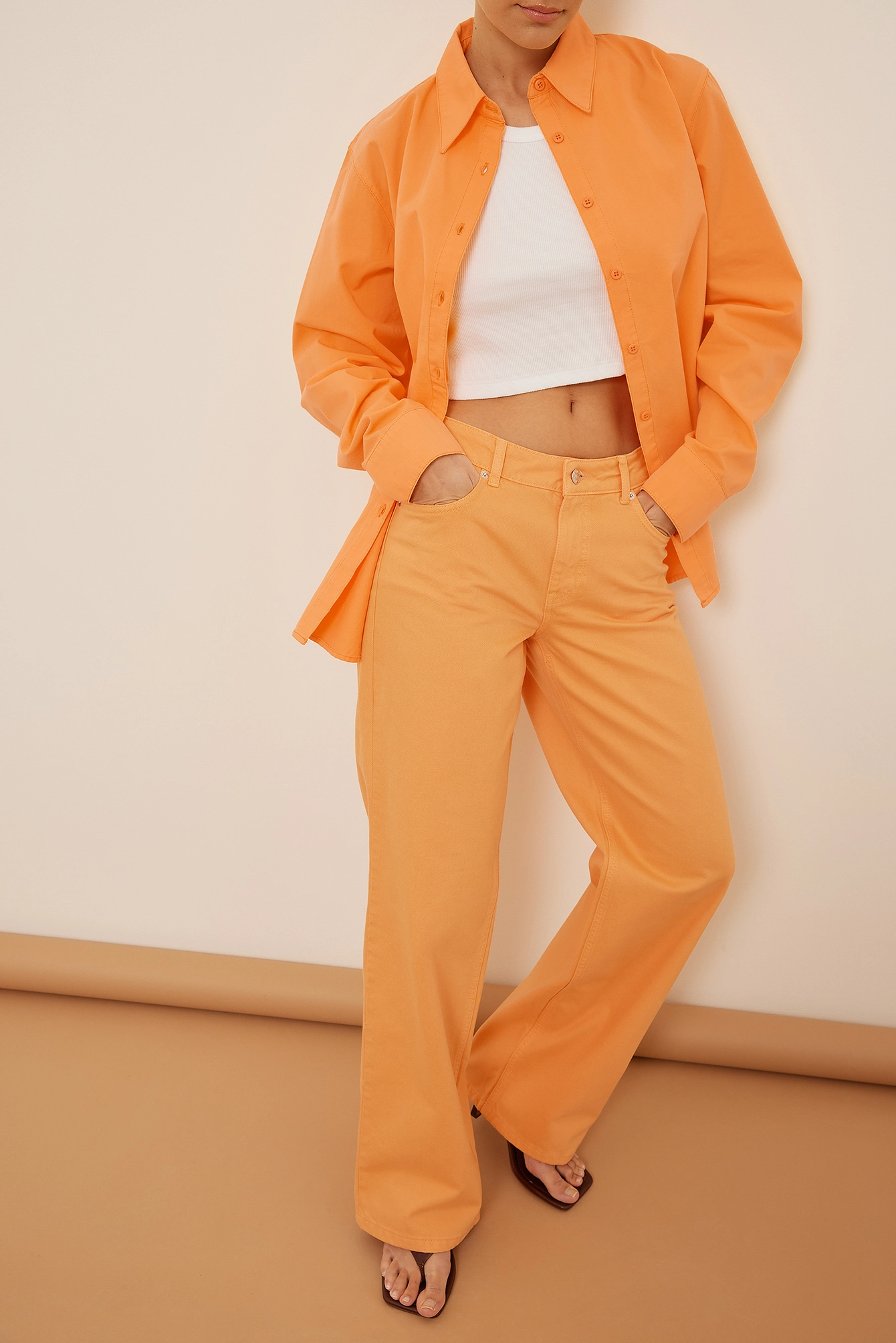 These 5-pocket jeans feature a zip and button closure. They have a high waist and a belt loop. These 5-pocket jeans feature wide legs.