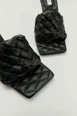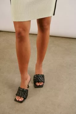 These heels feature squared, open toes, a woven look and thin heels. Measurements in size 39: Sole height: 0,2 cm / 0.1 in. Heel height: 7,4 cm / 2.15 in. Insole length: 26 cm / 10 in.