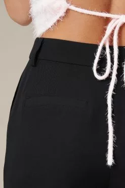 These suit pants feature a high waist fit, a belt loop, two mock pockets at the back, two front side slanting pockets, a slightly flared leg and a zipper and hook closure.