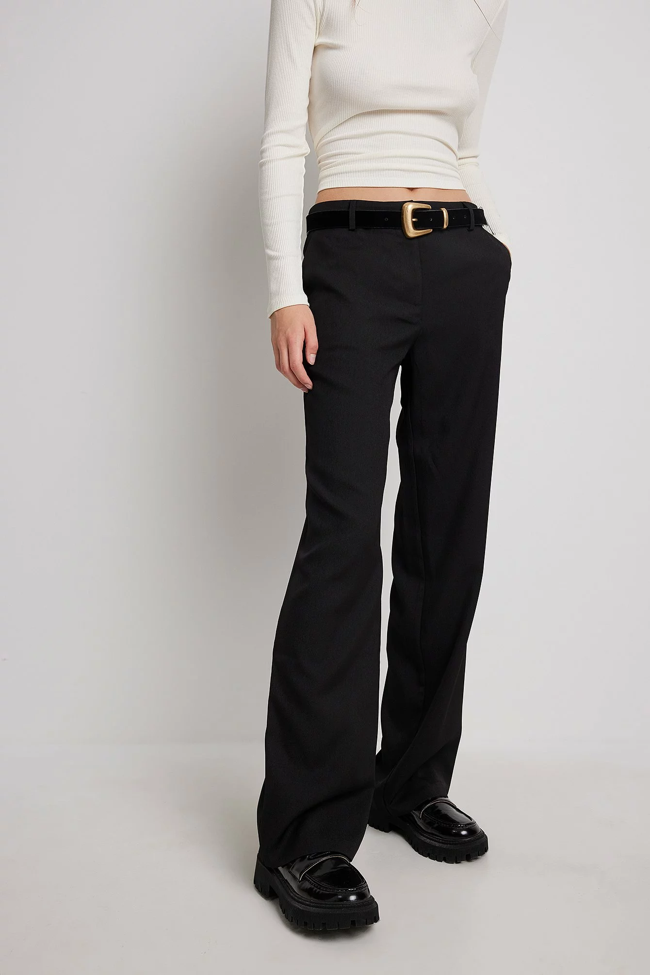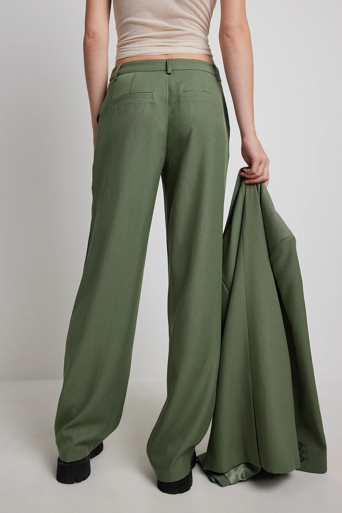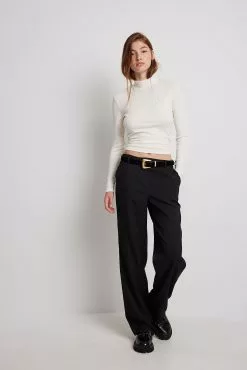These two trousers feature a high waist with a zip and hook closure, two open pockets on the side, two back mock pockets and a straight leg.