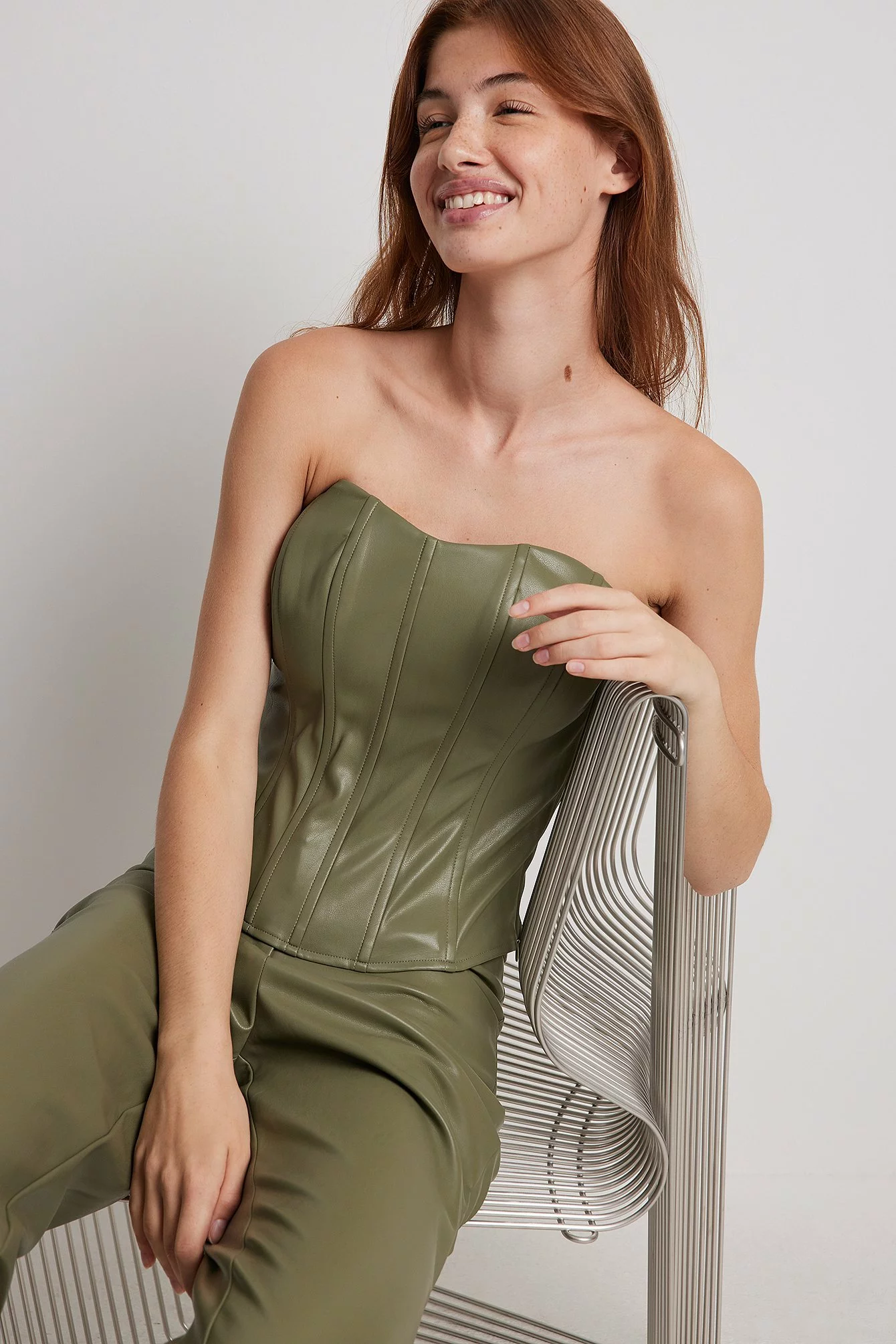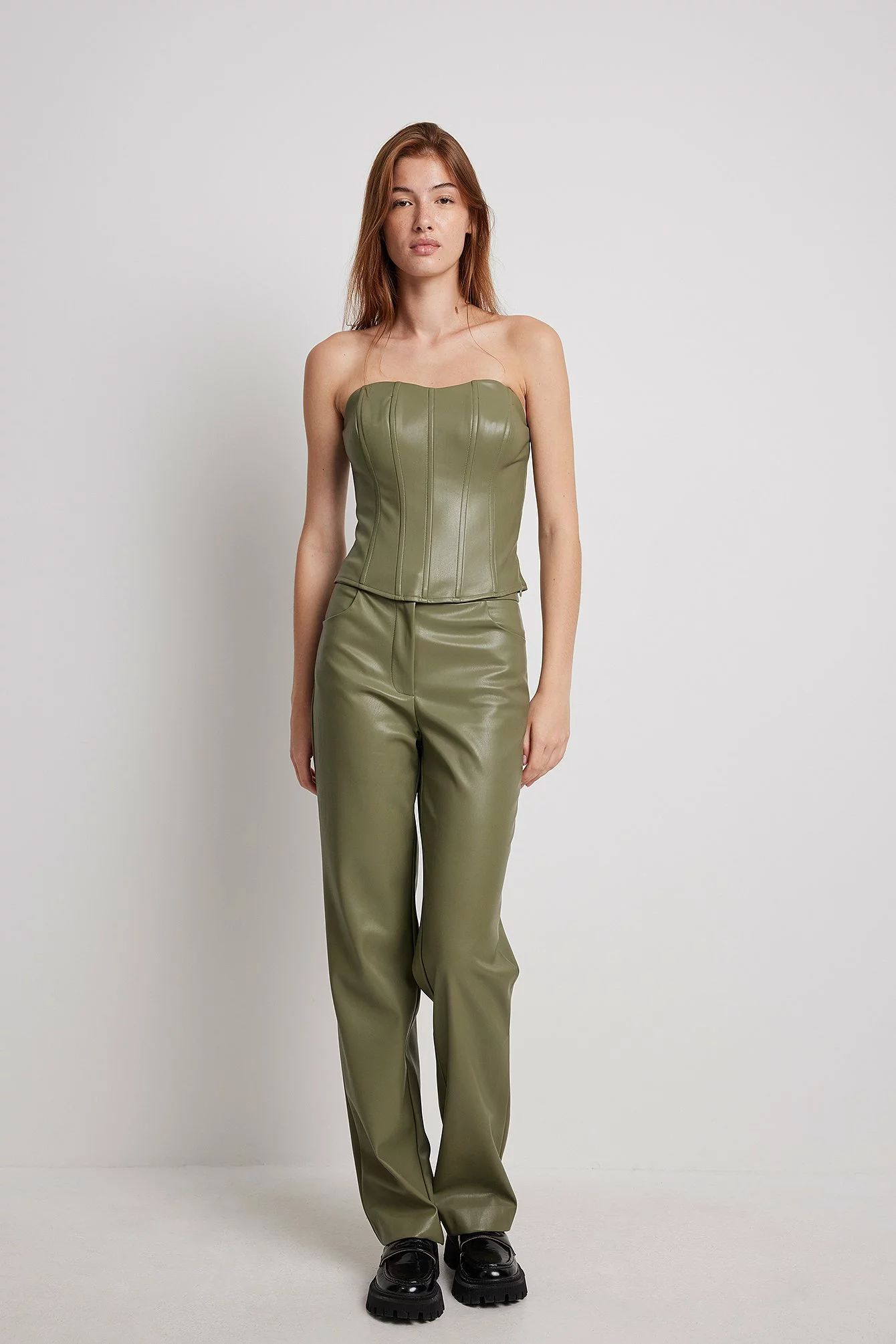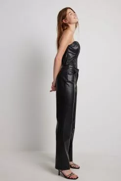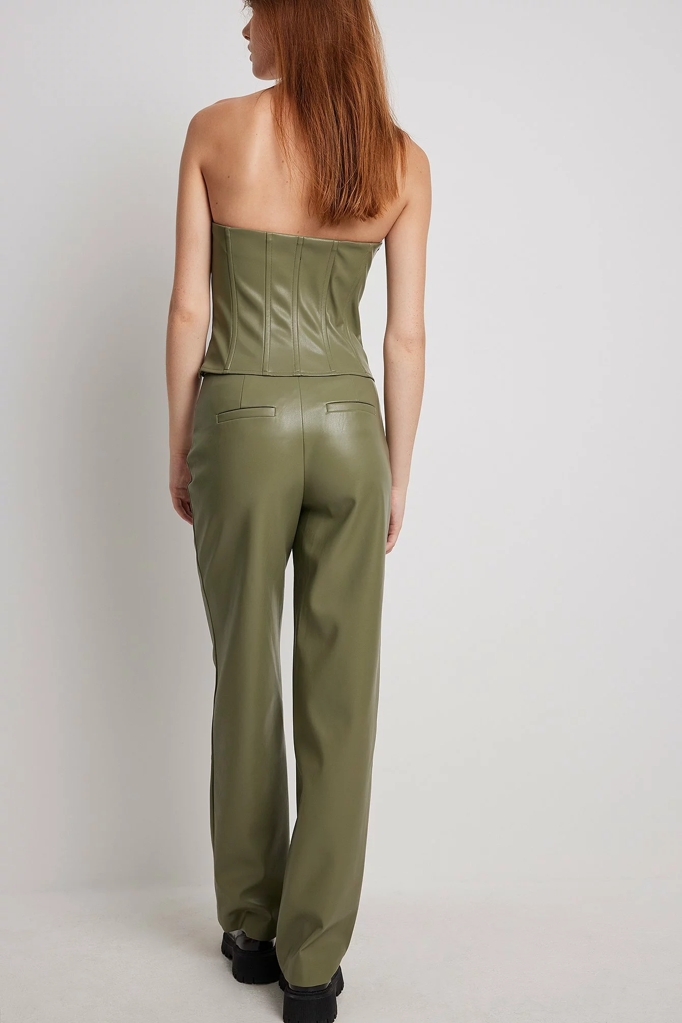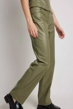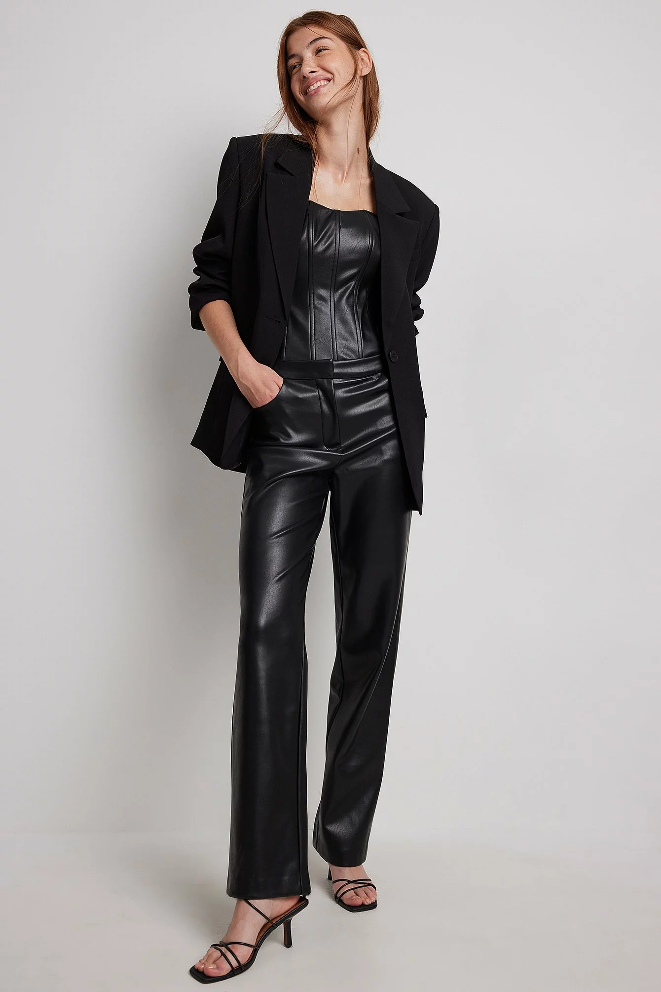 These trousers are made of PU and feature a high waist, a zipper, hook and button closure, side pockets, back mock pockets and a straight fit.