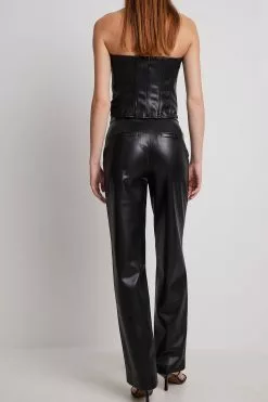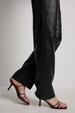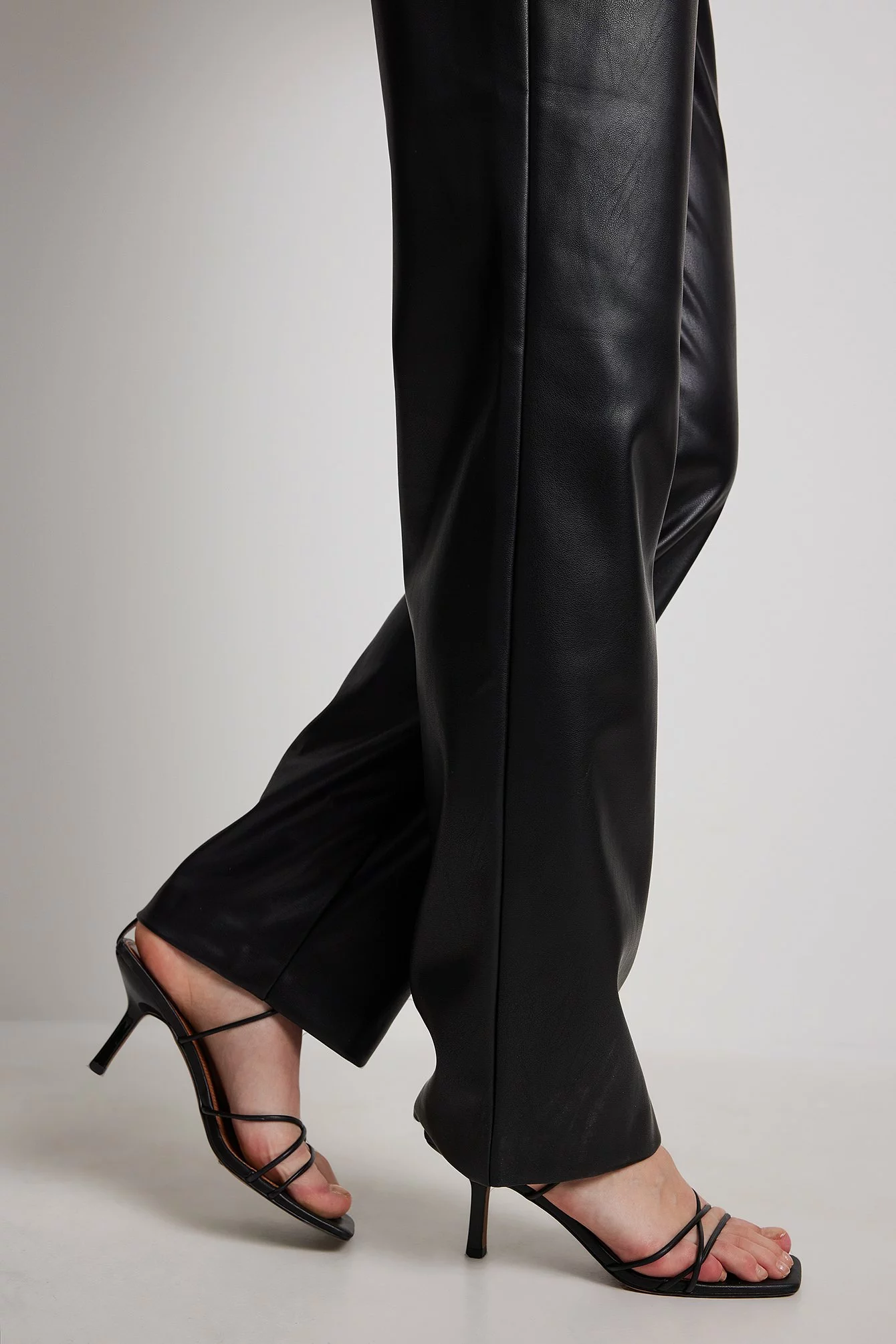 These trousers are made of PU and feature a high waist, a zipper, hook and button closure, side pockets, back mock pockets and a straight fit.