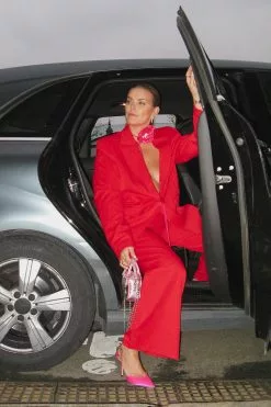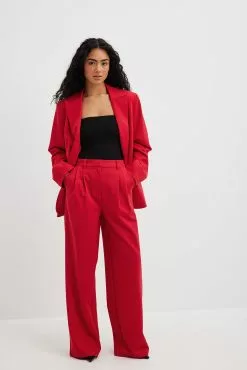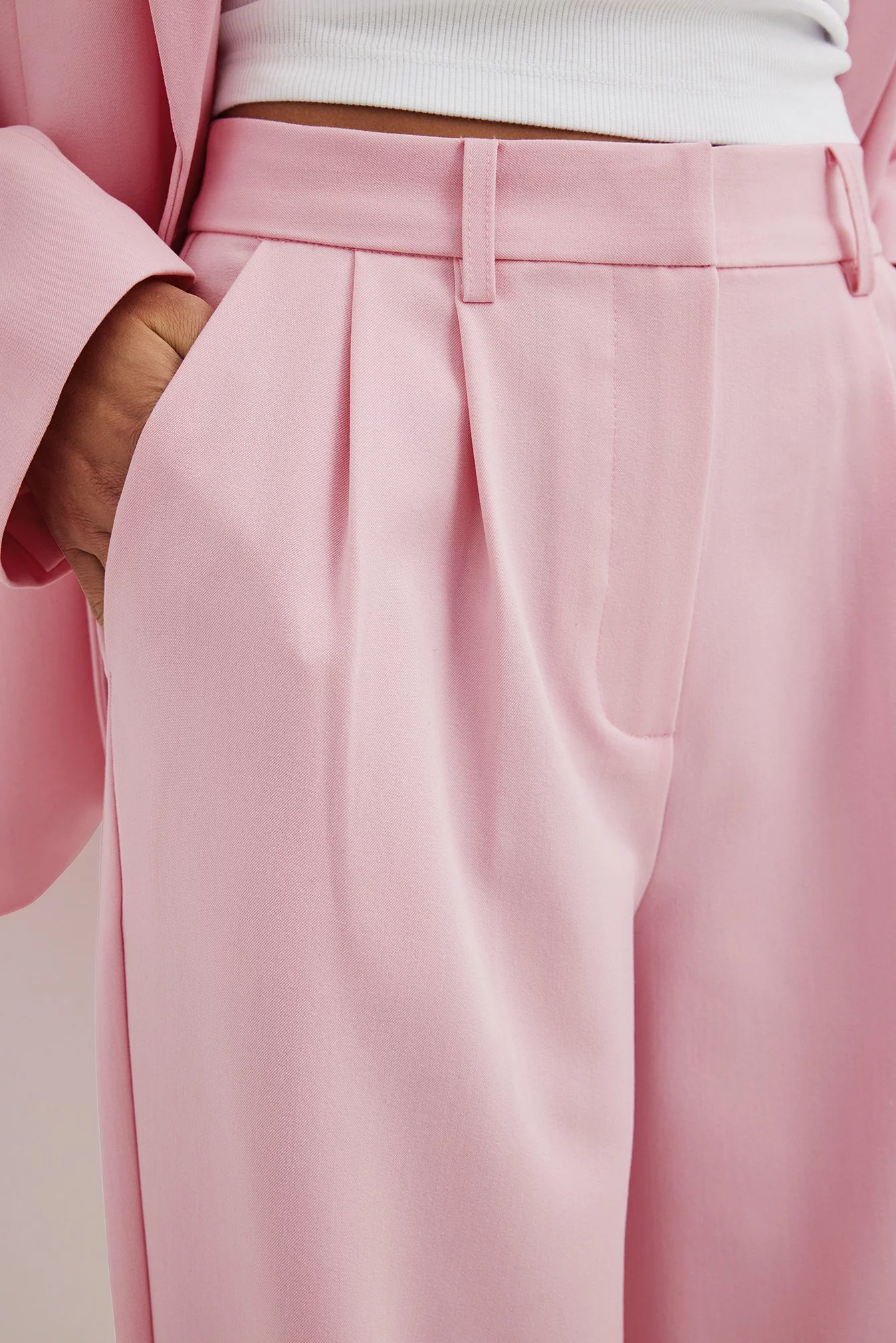 These trousers feature a high waist with a zipper, hook and button closure. They have a pleat detail on the front and open side pockets. These trousers feature two mock pockets on the back and a wide leg.