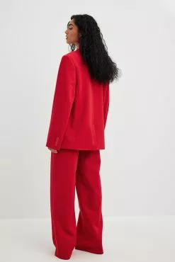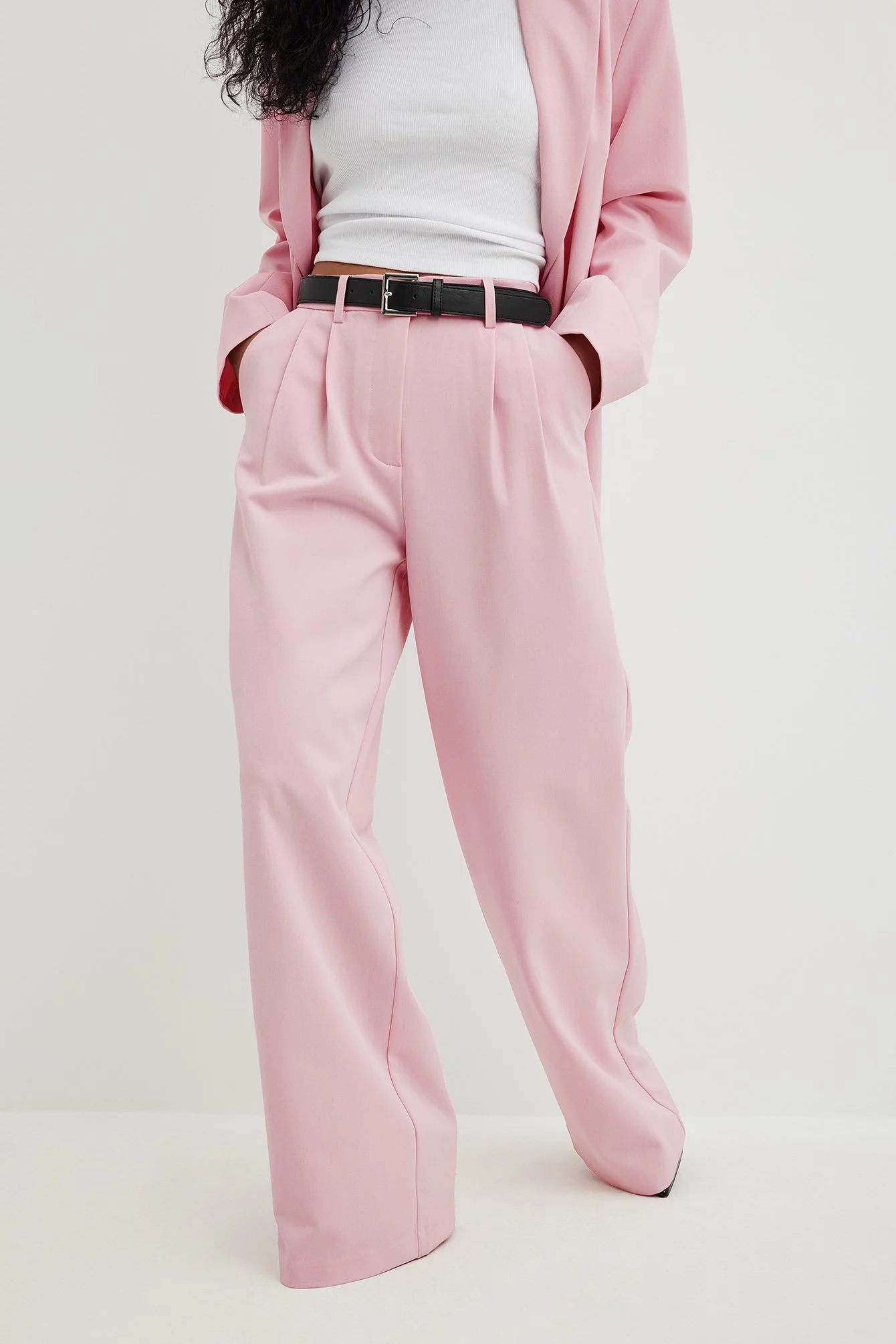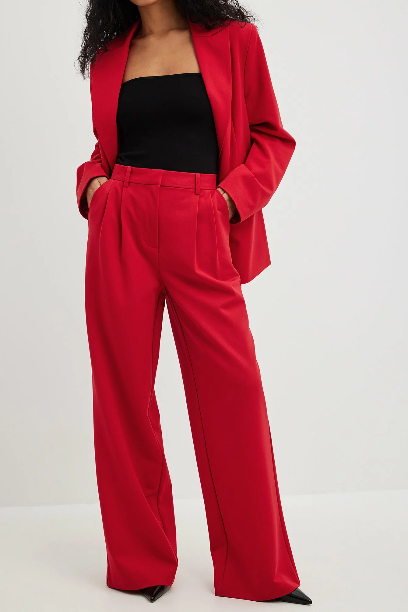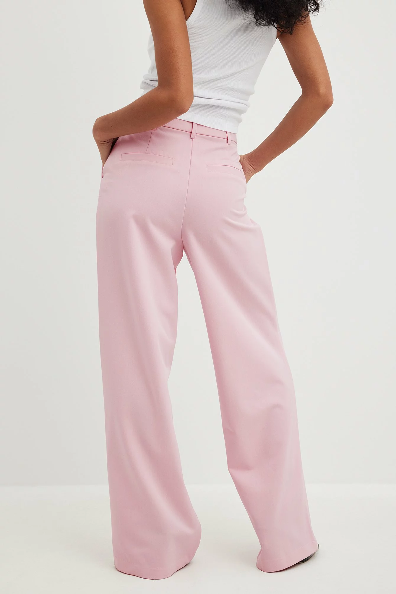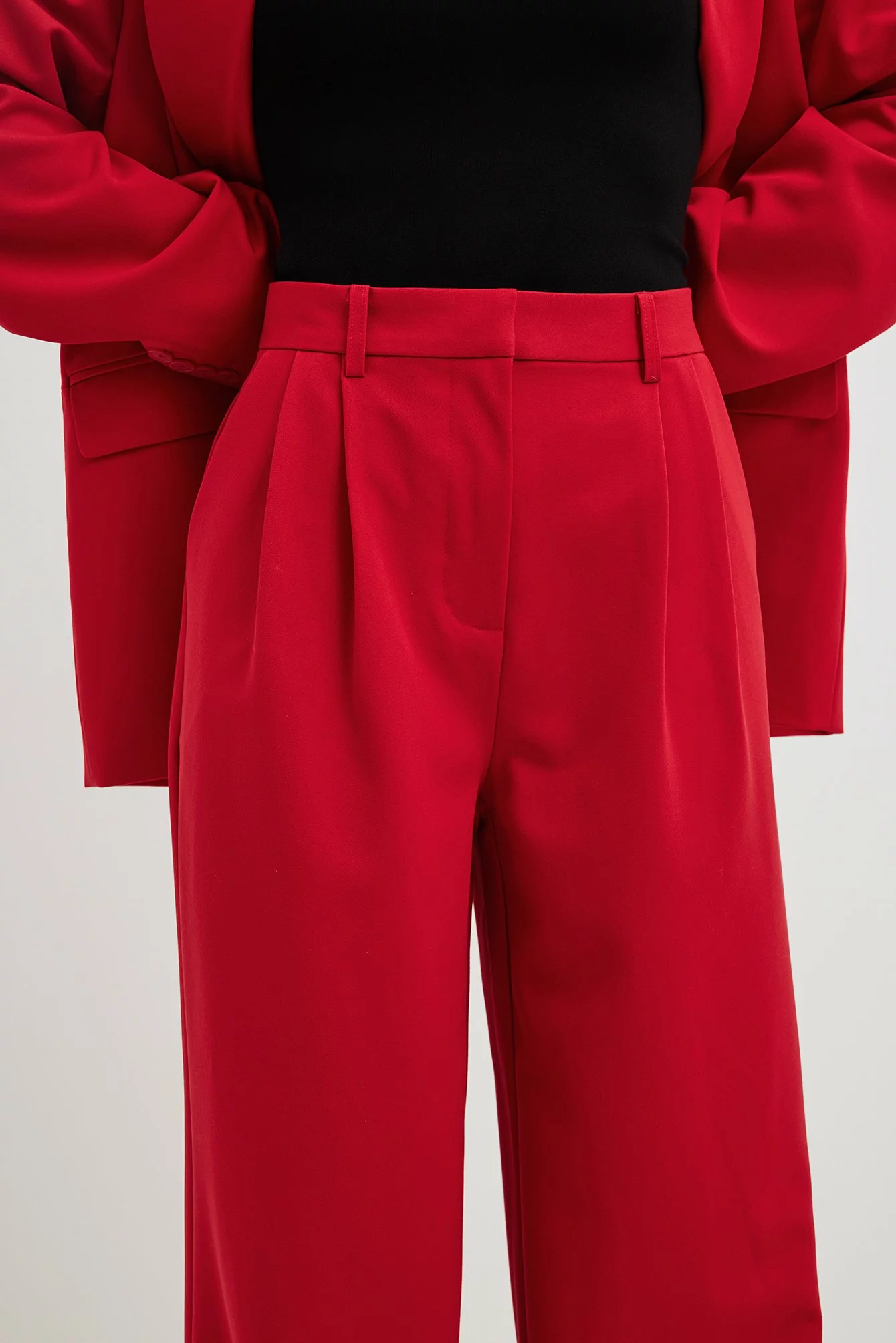 These trousers feature a high waist with a zipper, hook and button closure. They have a pleat detail on the front and open side pockets. These trousers feature two mock pockets on the back and a wide leg.