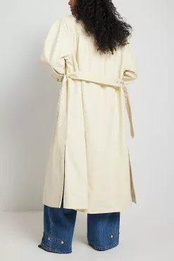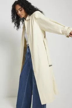 These trenchcoats are belted and feature a shirt collar, padded shoulders with draped details, a long sleeve with buckle closures, a covered button closure and side pockets.