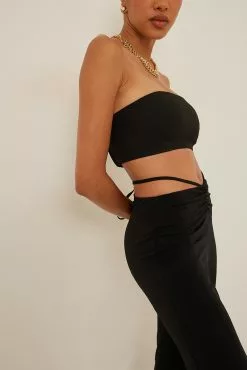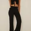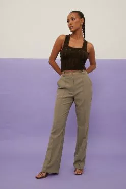 These pants feature a self tie waist detail, a gathered seam on the front and a straight leg.