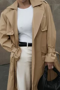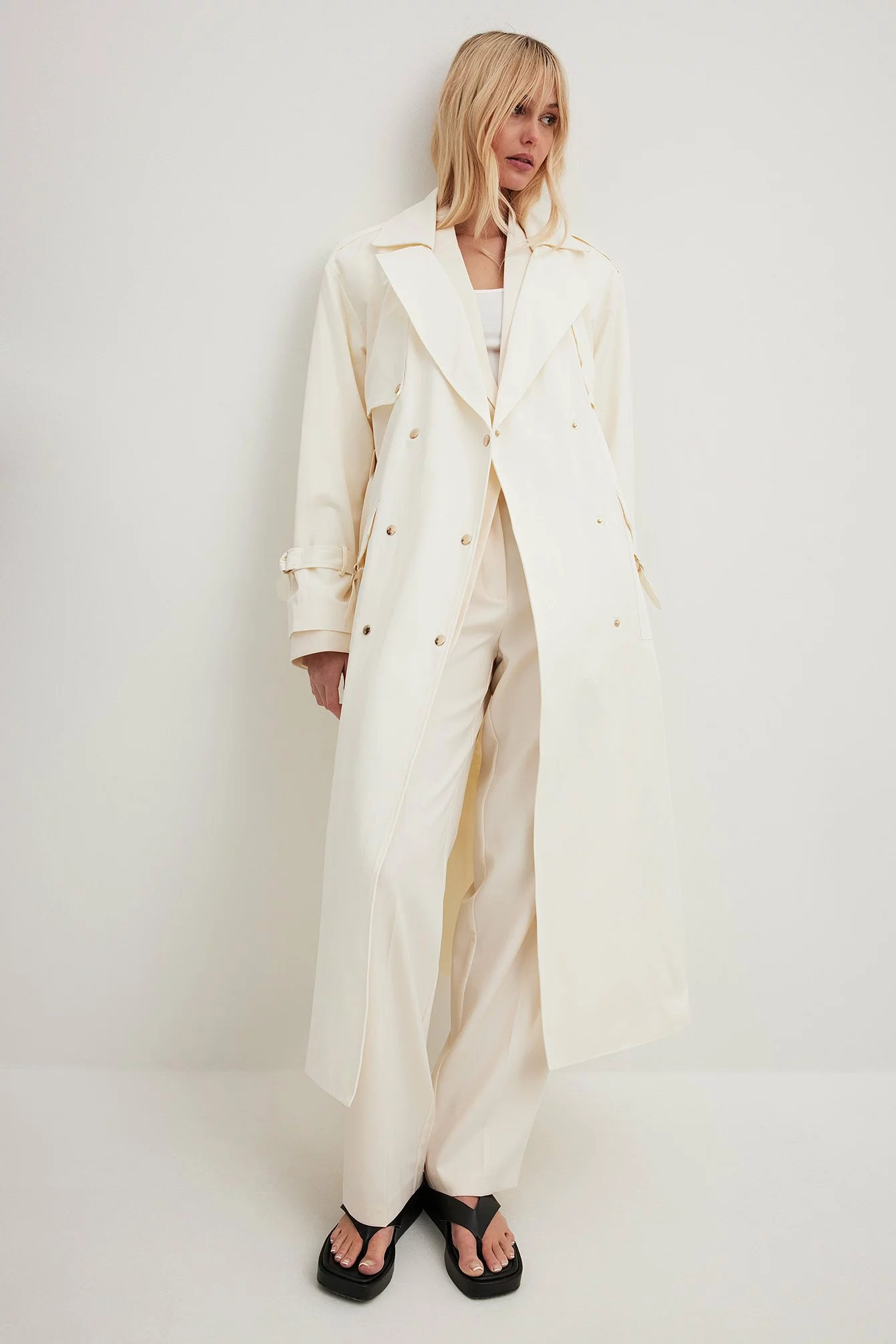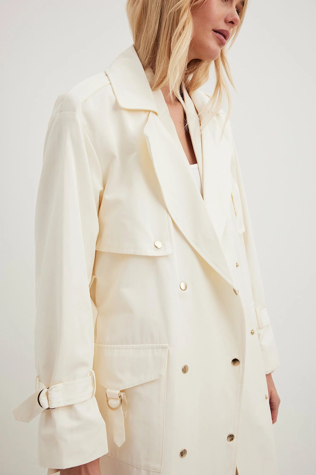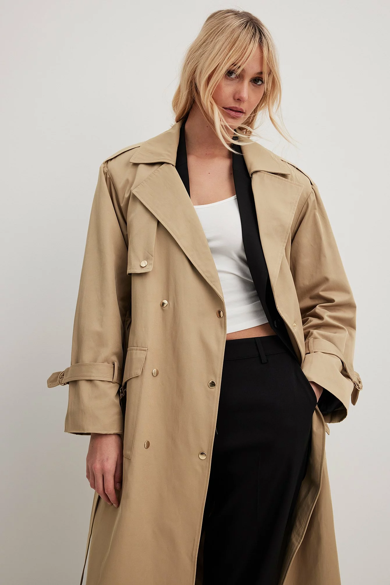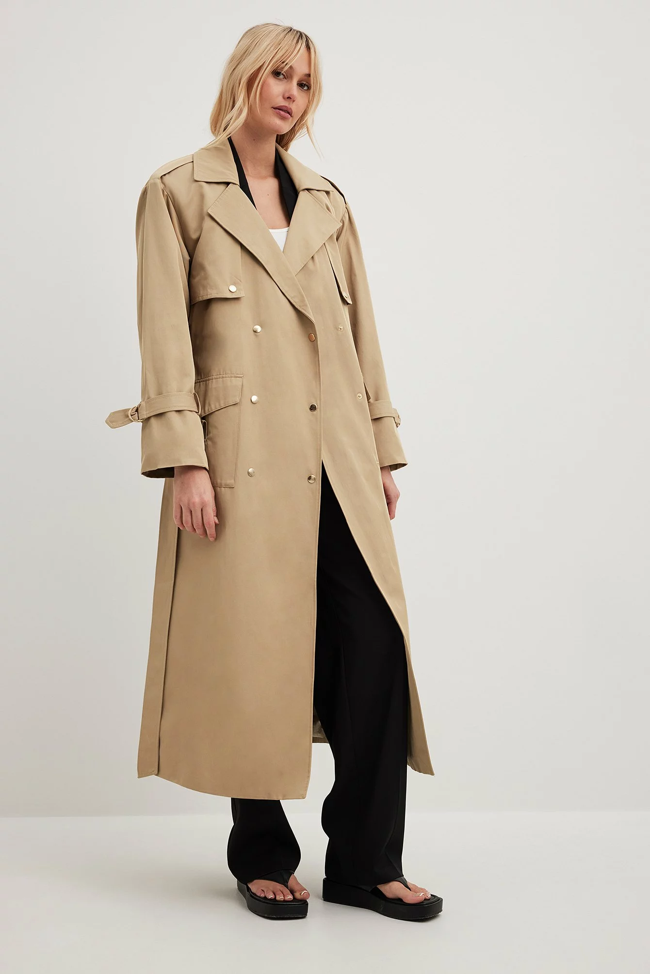 This trenchcoat is belted and features a double-breasted button design with a snap button closure. It has patched front flap pockets with a d-ring strap detail and a back slit detail. This trenchcoat features d-ring strap details on the sleeves.