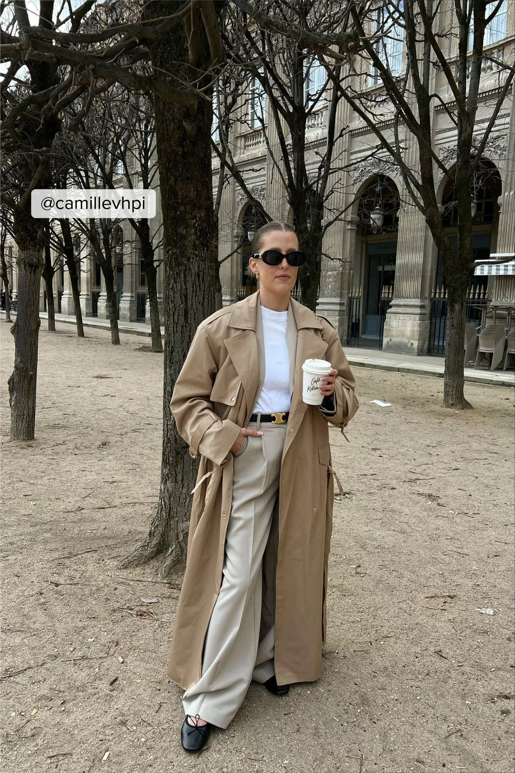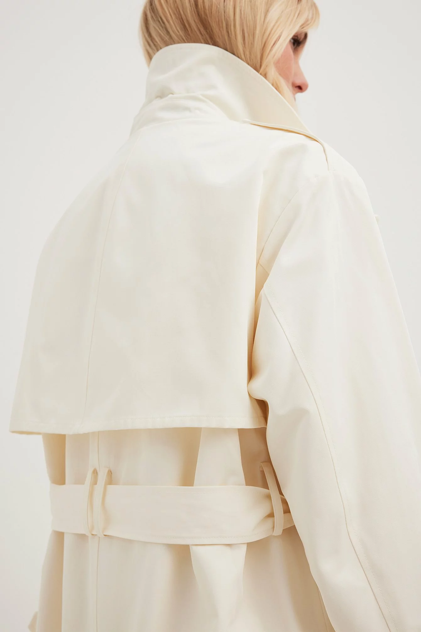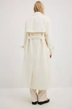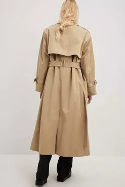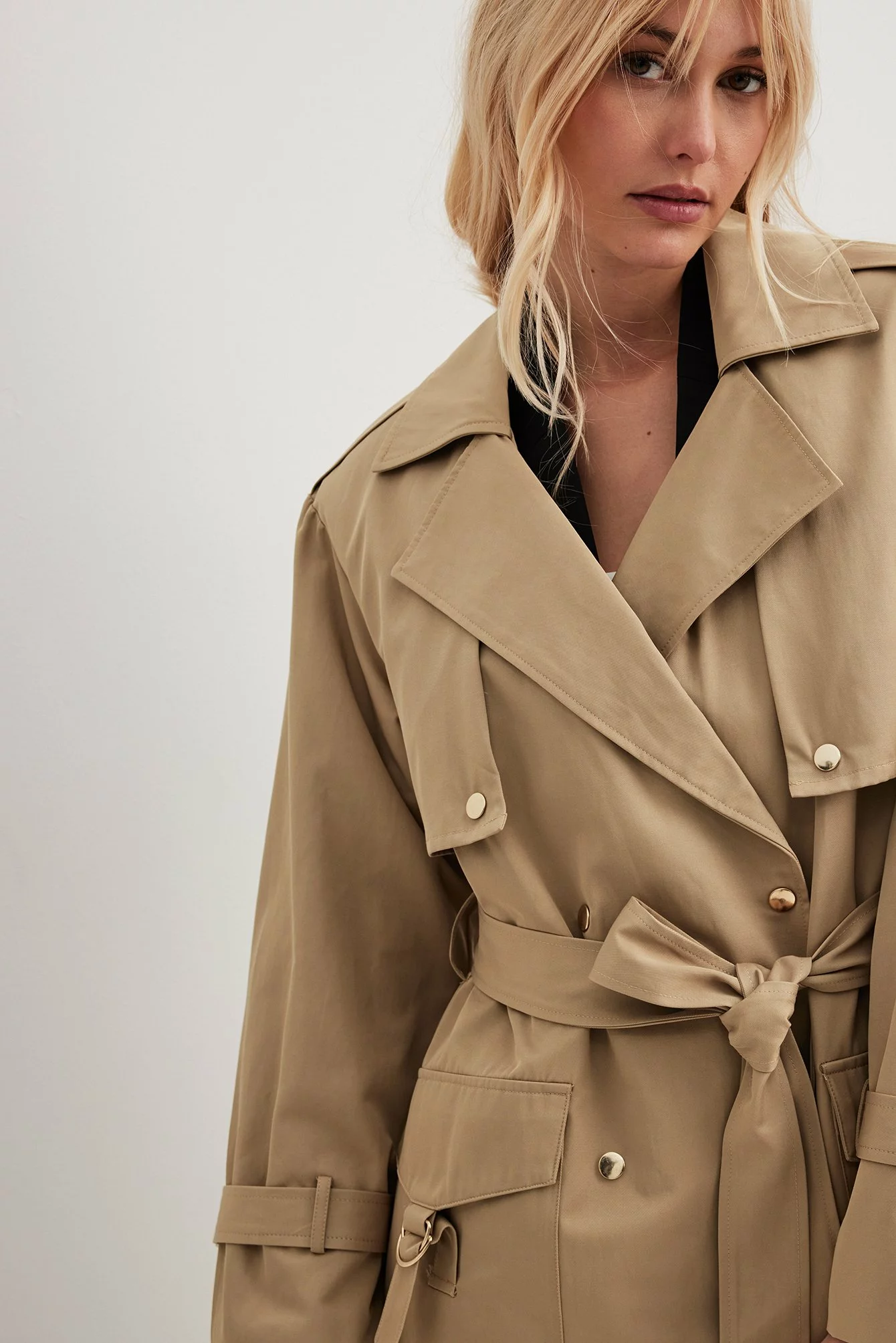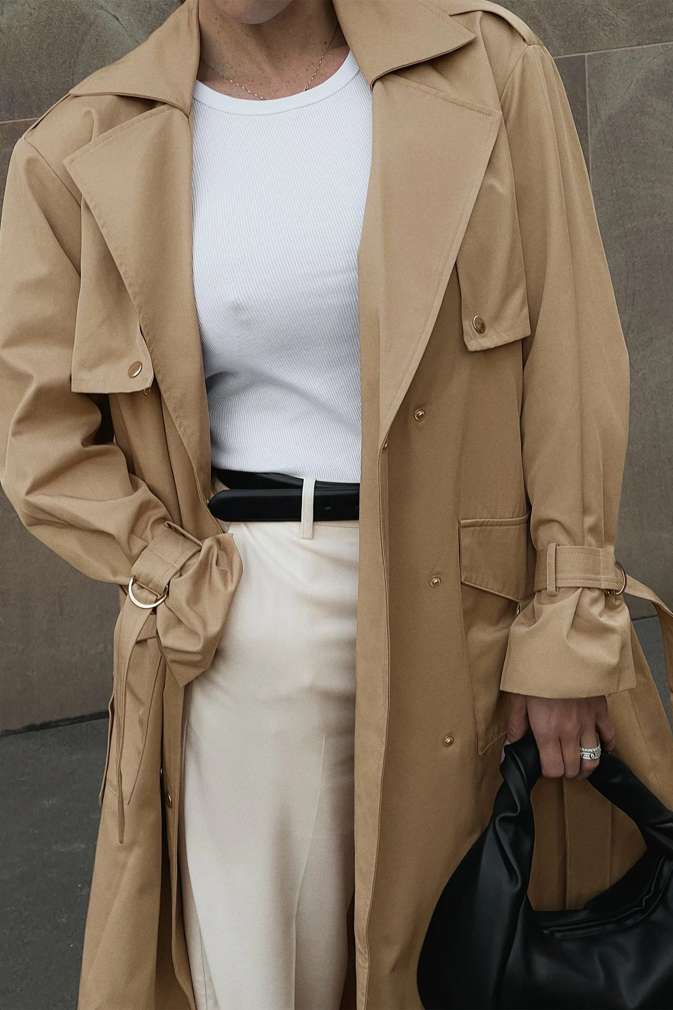 This trenchcoat is belted and features a double-breasted button design with a snap button closure. It has patched front flap pockets with a d-ring strap detail and a back slit detail. This trenchcoat features d-ring strap details on the sleeves.