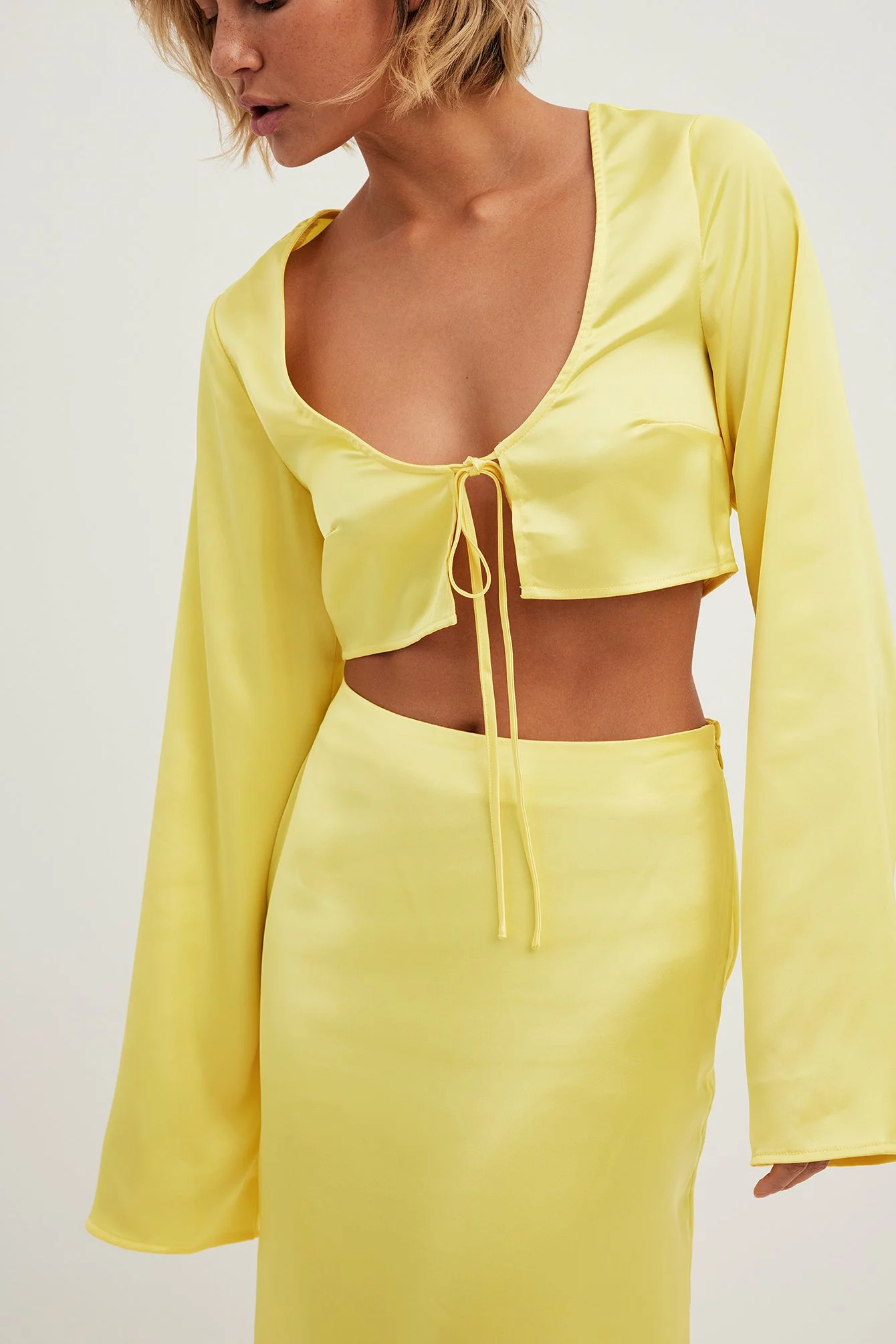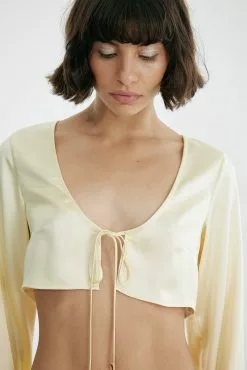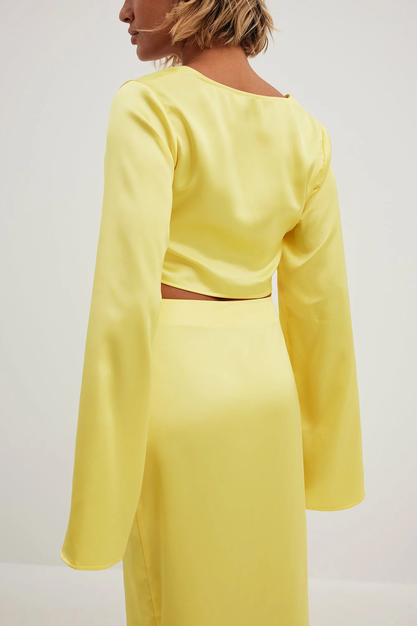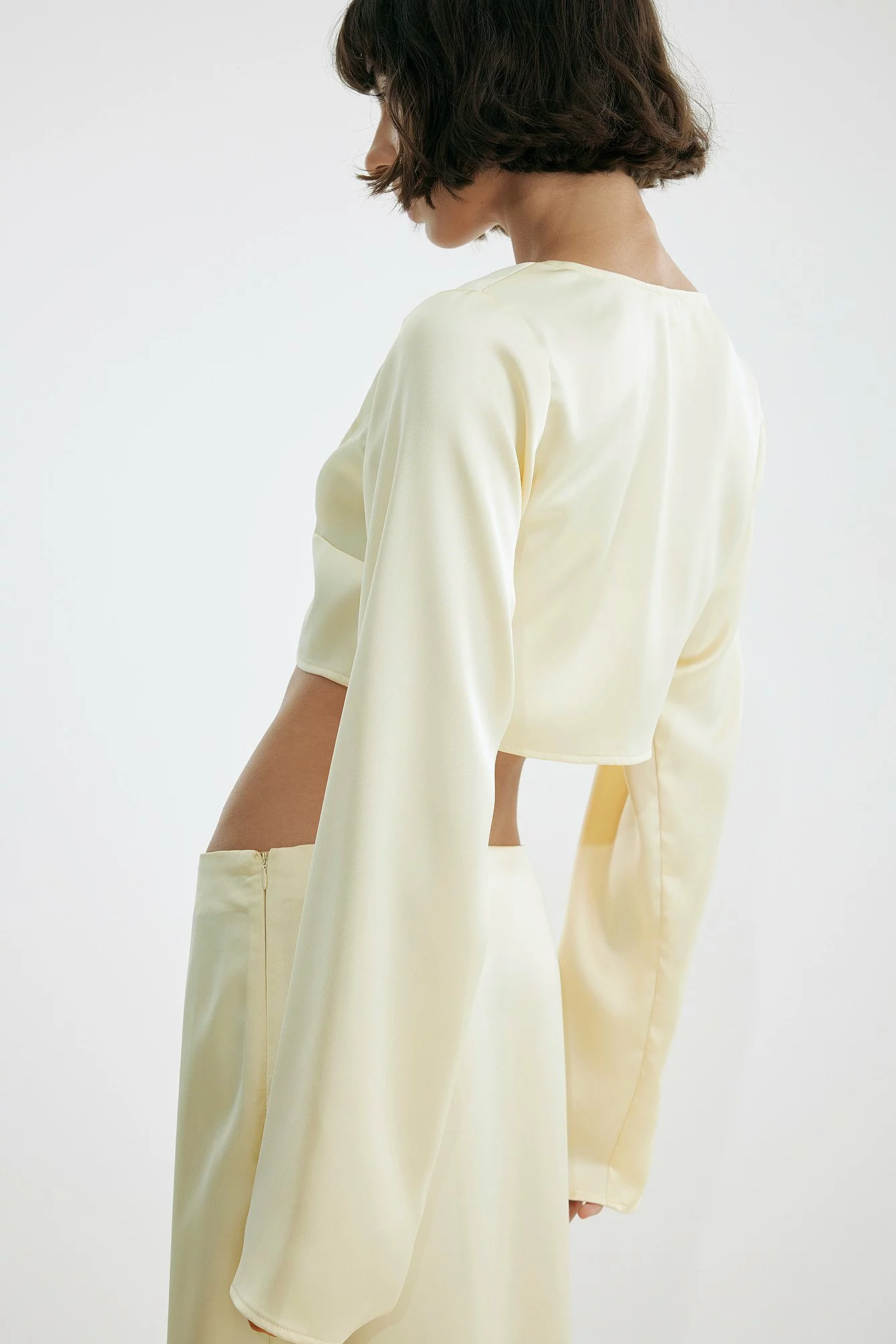 This top features a rounded neckline with a self-tie knot, wide long sleeves, cropped length and satin material.