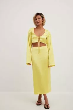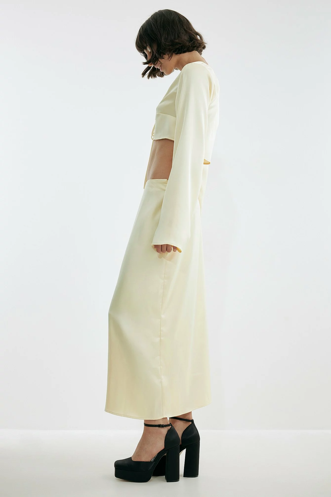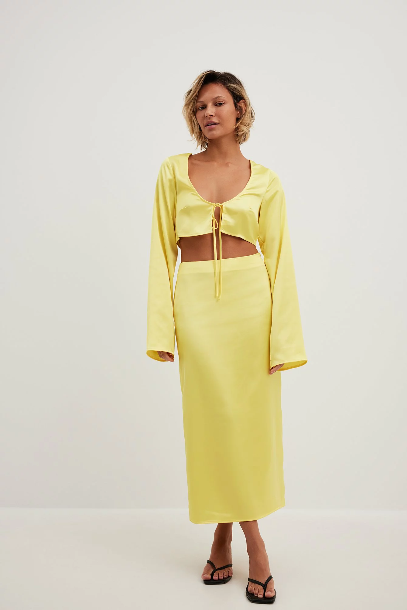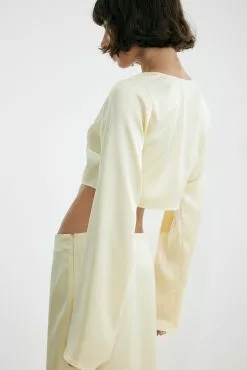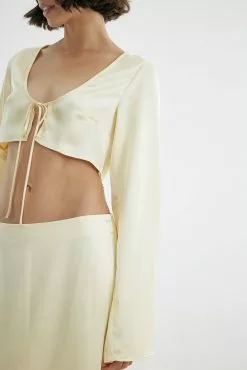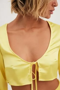 This top features a rounded neckline with a self-tie knot, wide long sleeves, cropped length and satin material.