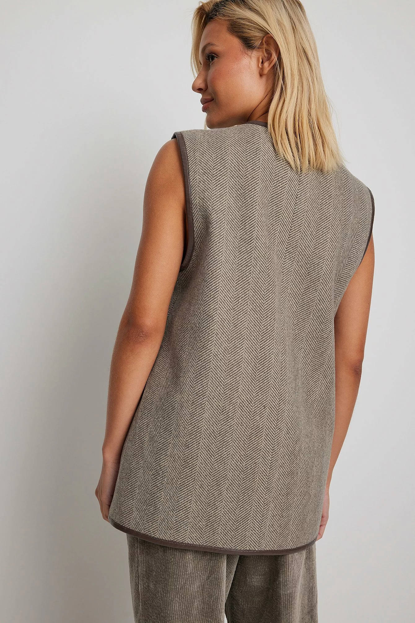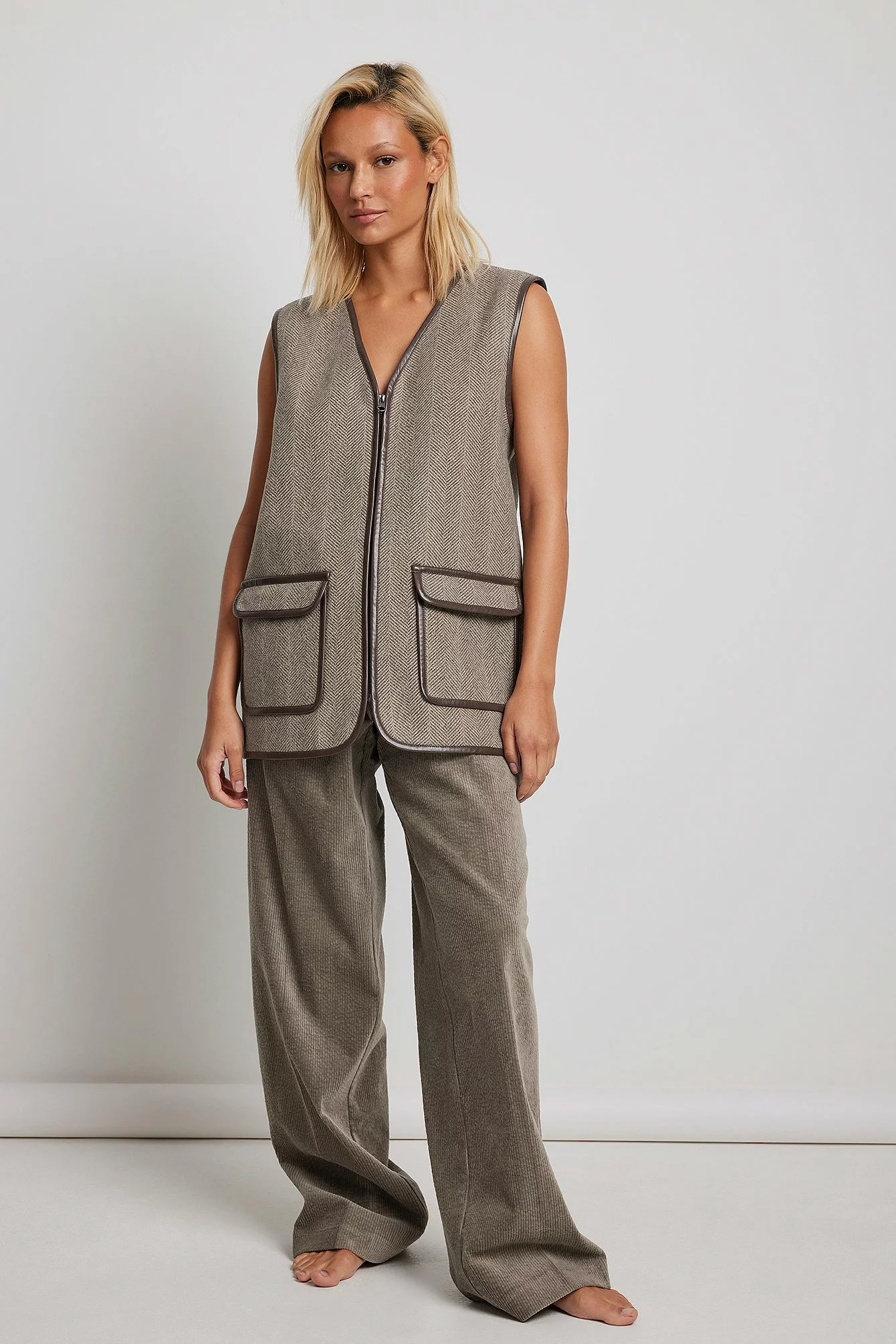 This vest is made of tweed and features faux leather details, a zipper closure, two front flap pockets and a fabric lining.