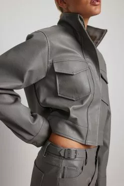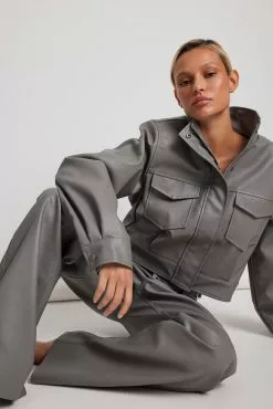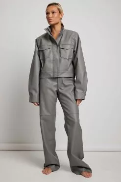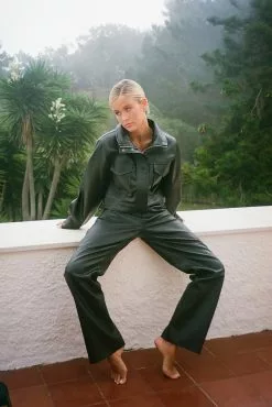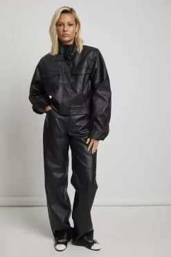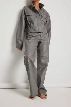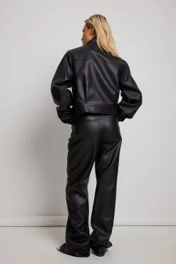These trousers feature a faux leather material, buckle details on the sides, two front pockets, two back pockets and a raw hem at the bottom.