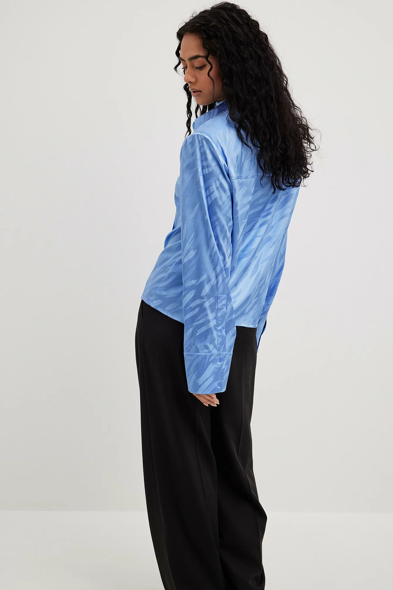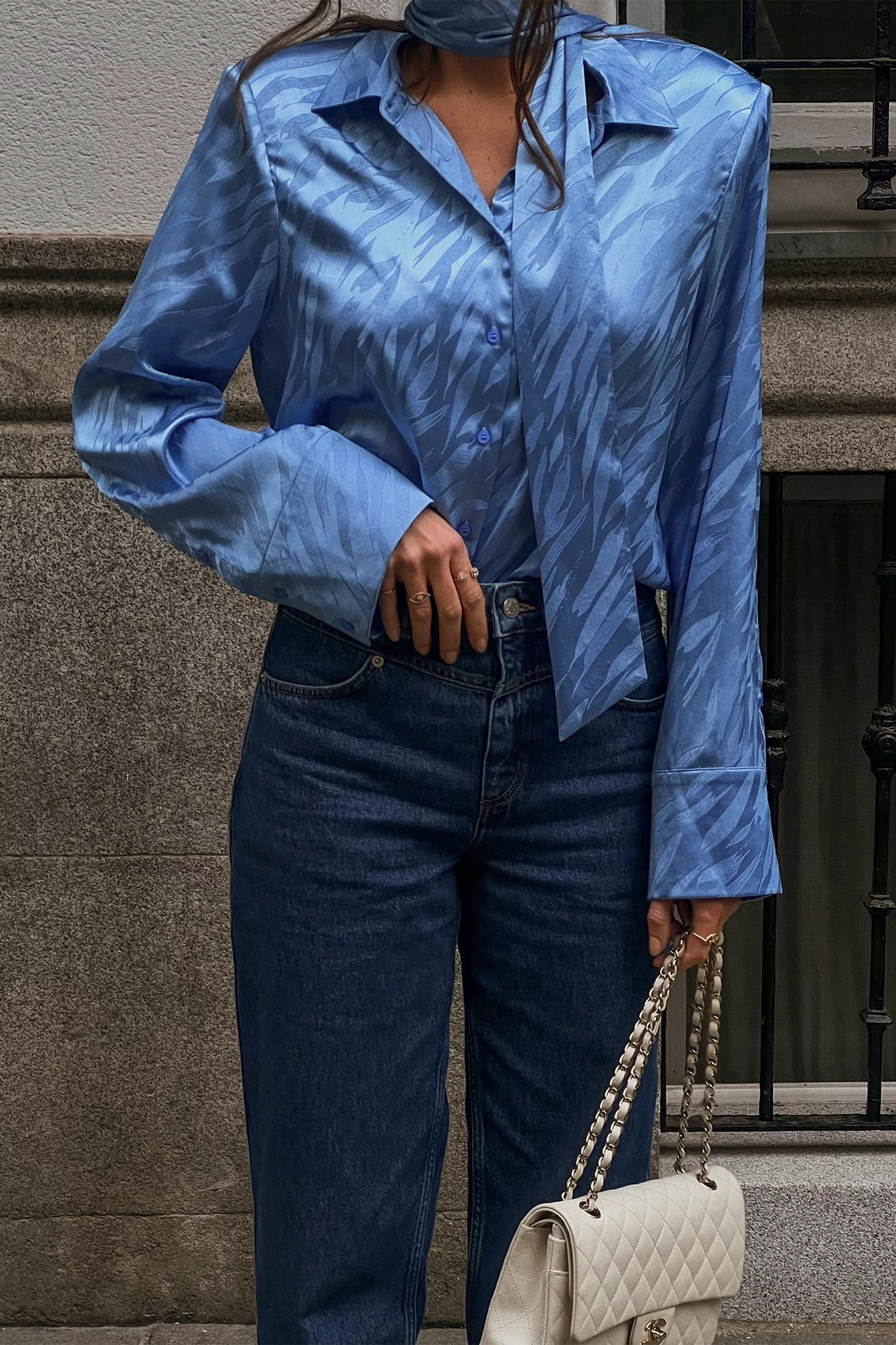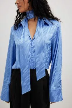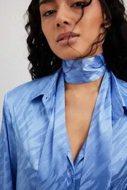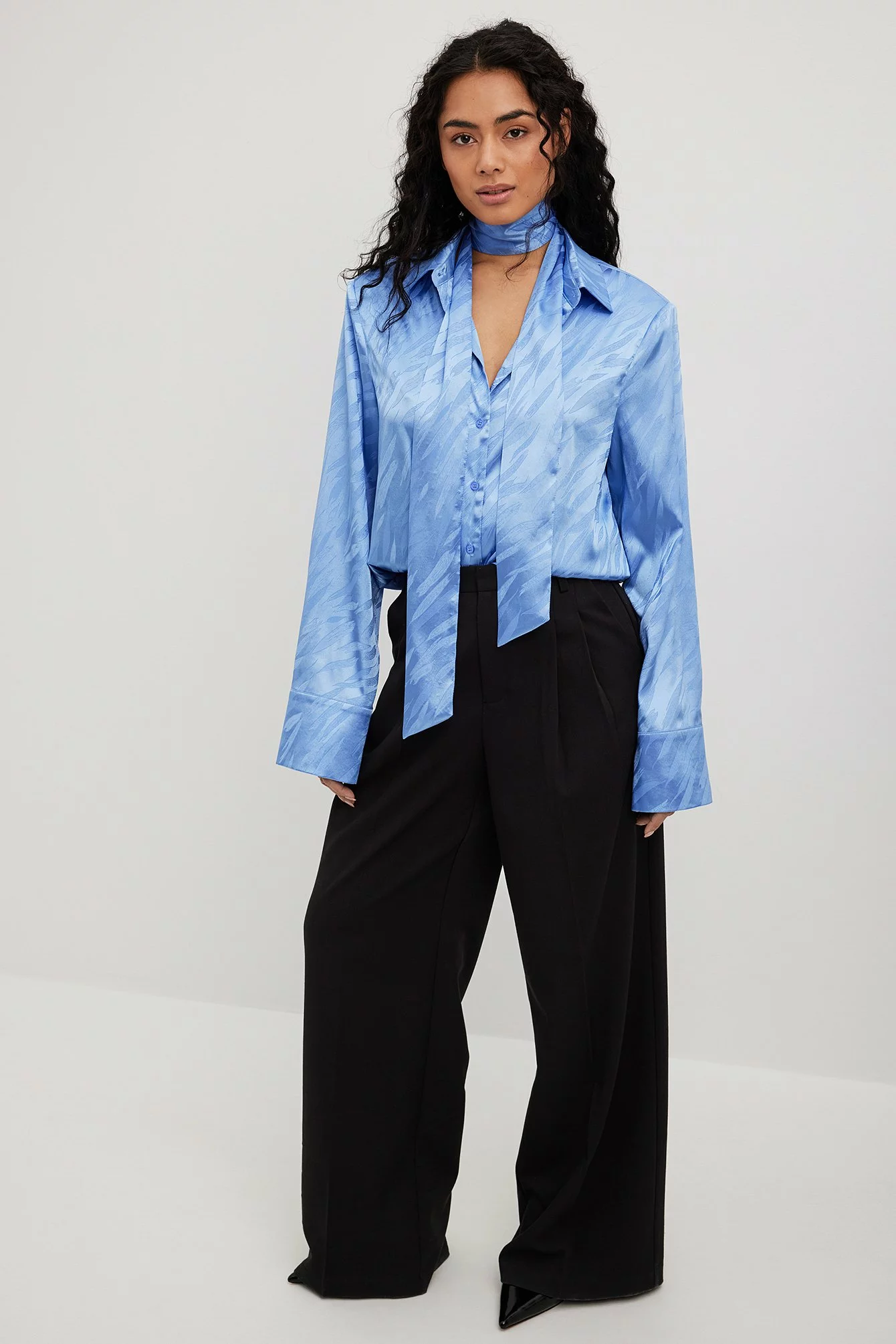 This shirt features a textured material with a satin touch. It has a removable scarf and a classic collar. This shirt features button closure, padded shoulders and long sleeves with button closures at the cuffs.