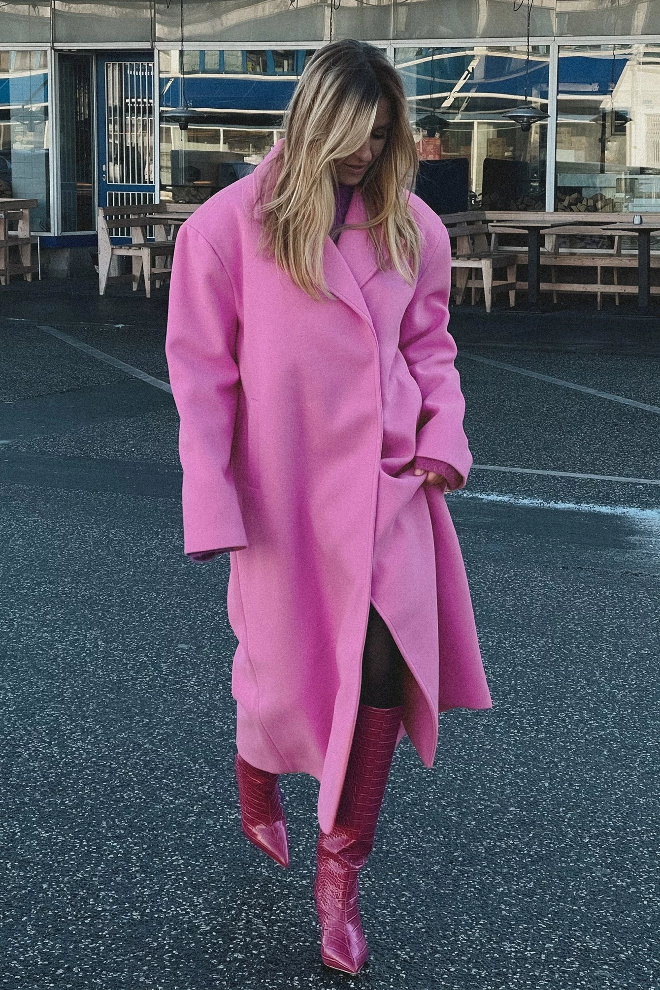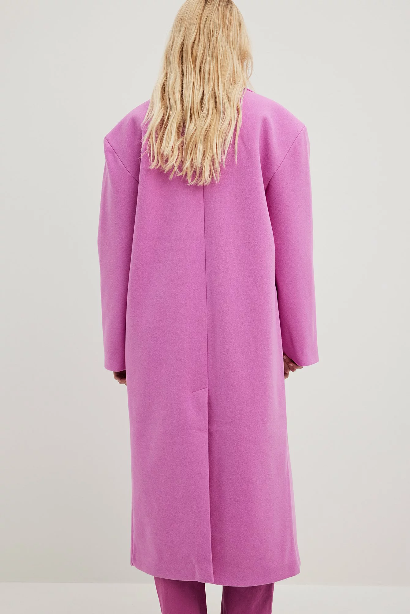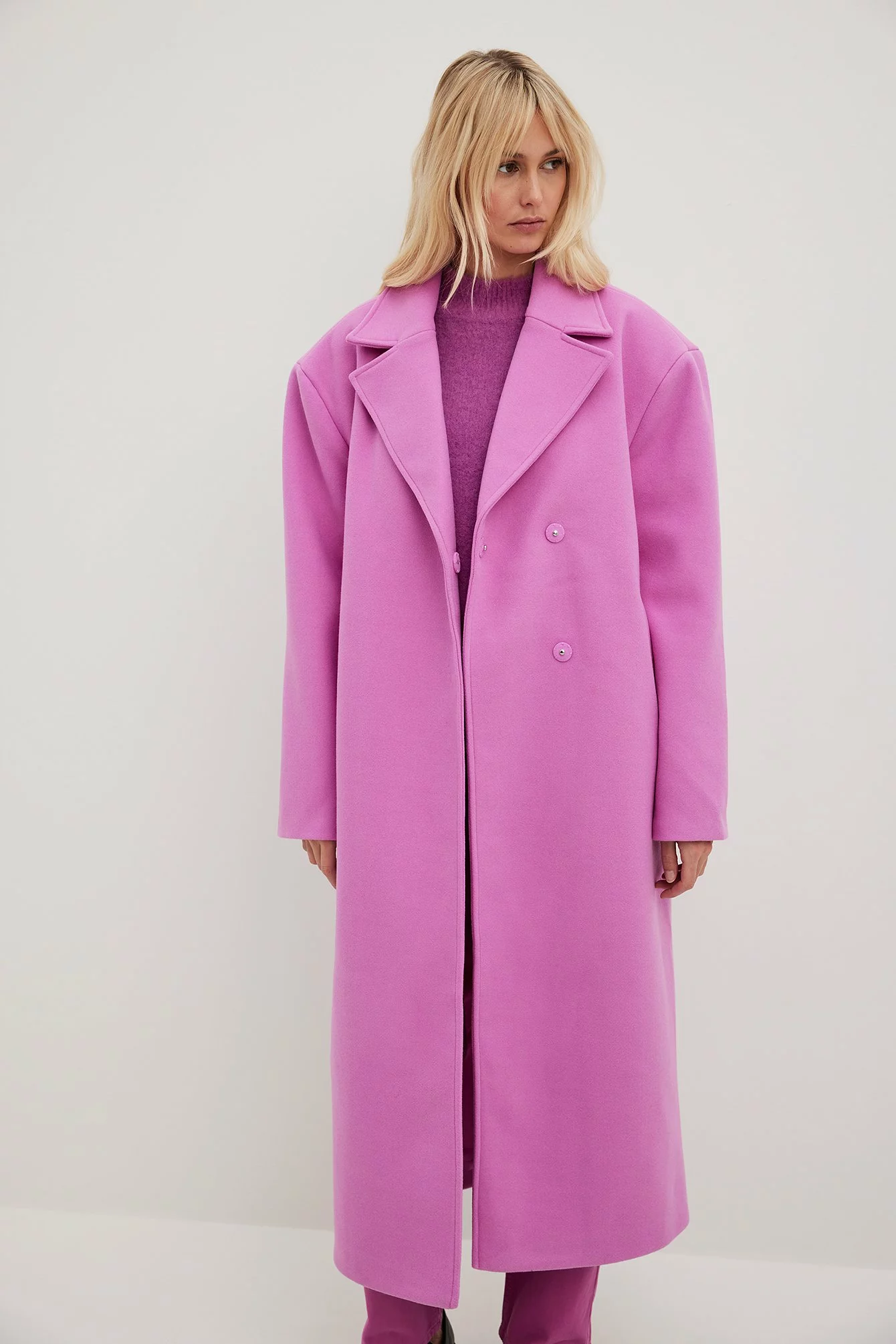 This coat is fully lined and features oversize fit. It has a lapel neckline and a double-breasted button closure. This coat features two side slanting pockets.